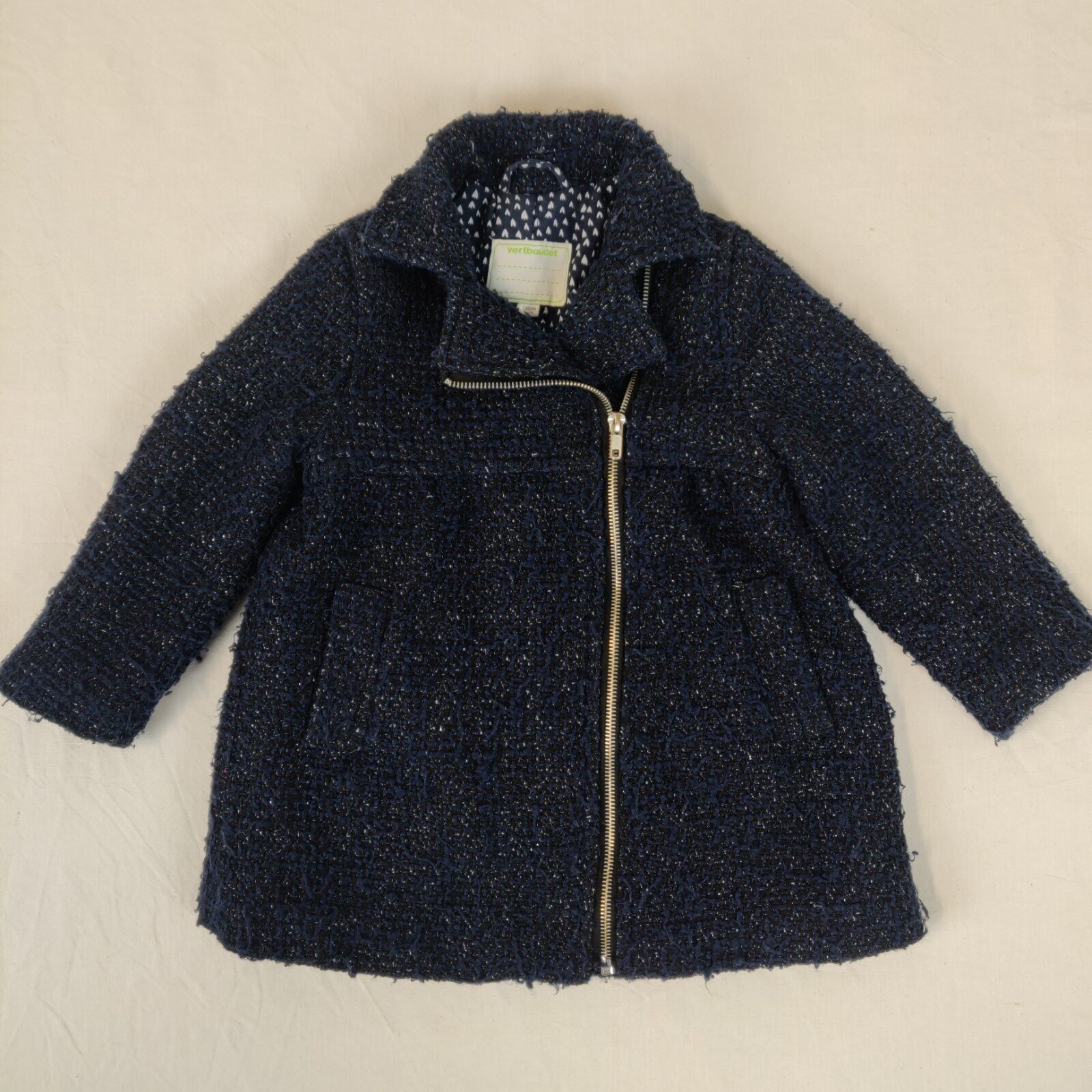 Autres commentaires : 13% acrylique, 6% laine, 2% fibres métalliques, 1% viscose, 1% polyamide. Veste doublée – bleu marine et noir. Ouverture en biais zippée. 2 poches latérales. Usure normale du vêtement.