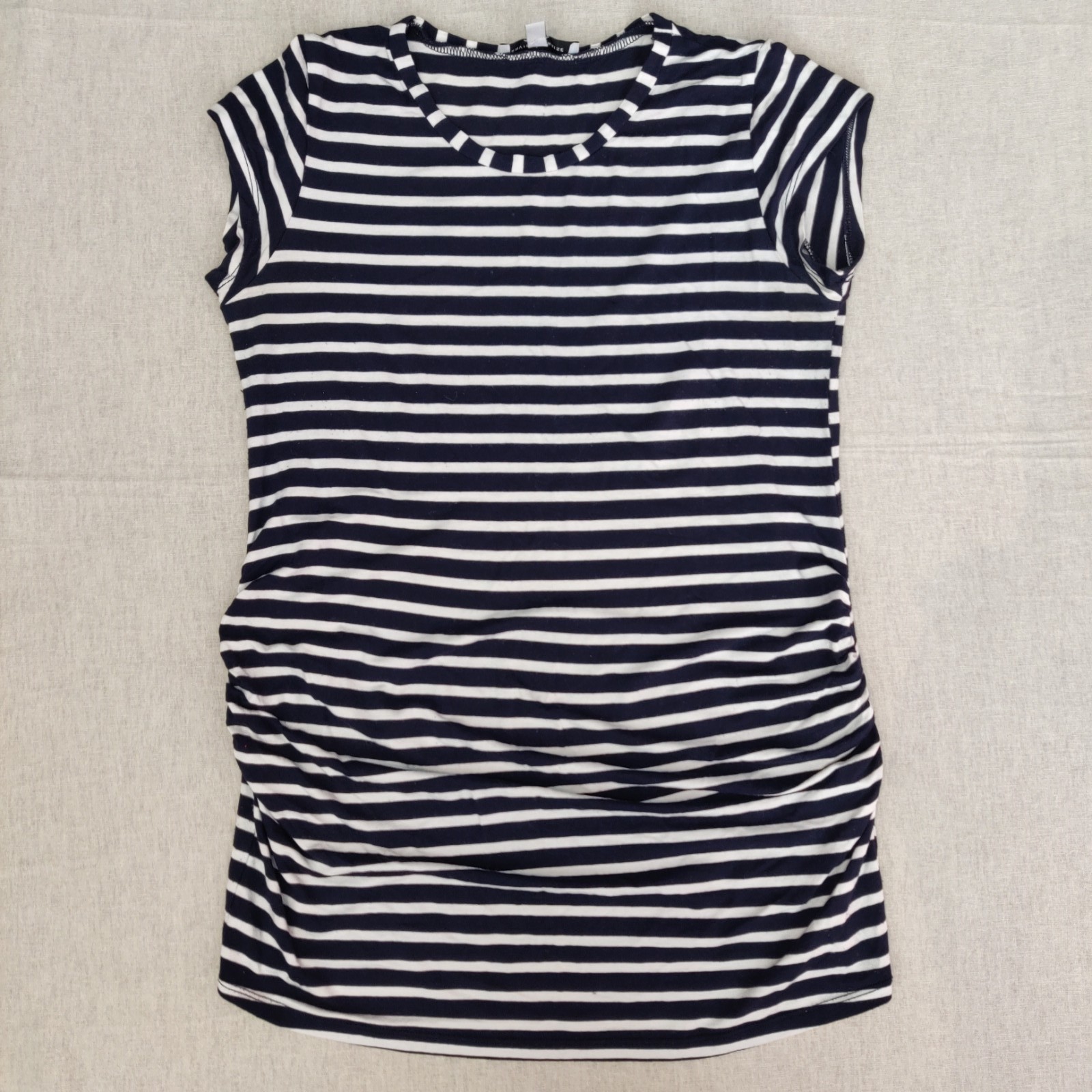Autres commentaires : 10% Elasthanne. Modèle Katia. Rayures marine et écru. Col rond, manches courtes, matière ultra douce qui s’ajuste à vos nouvelles courbes de femme enceinte et sa coupe parfaite qui met en valeur l’arrondi de votre ventre. Longueur 63 cm.
