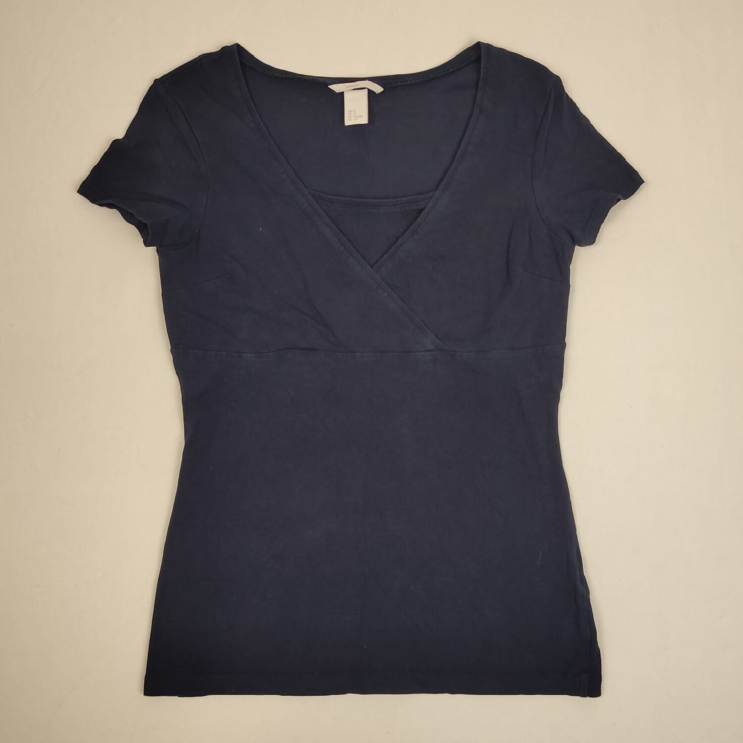 Autres commentaires : 5% élasthanne. T-shirt manches courtes uni bleu marine, de grossesse et d’allaitement, col croisé avec plastron.