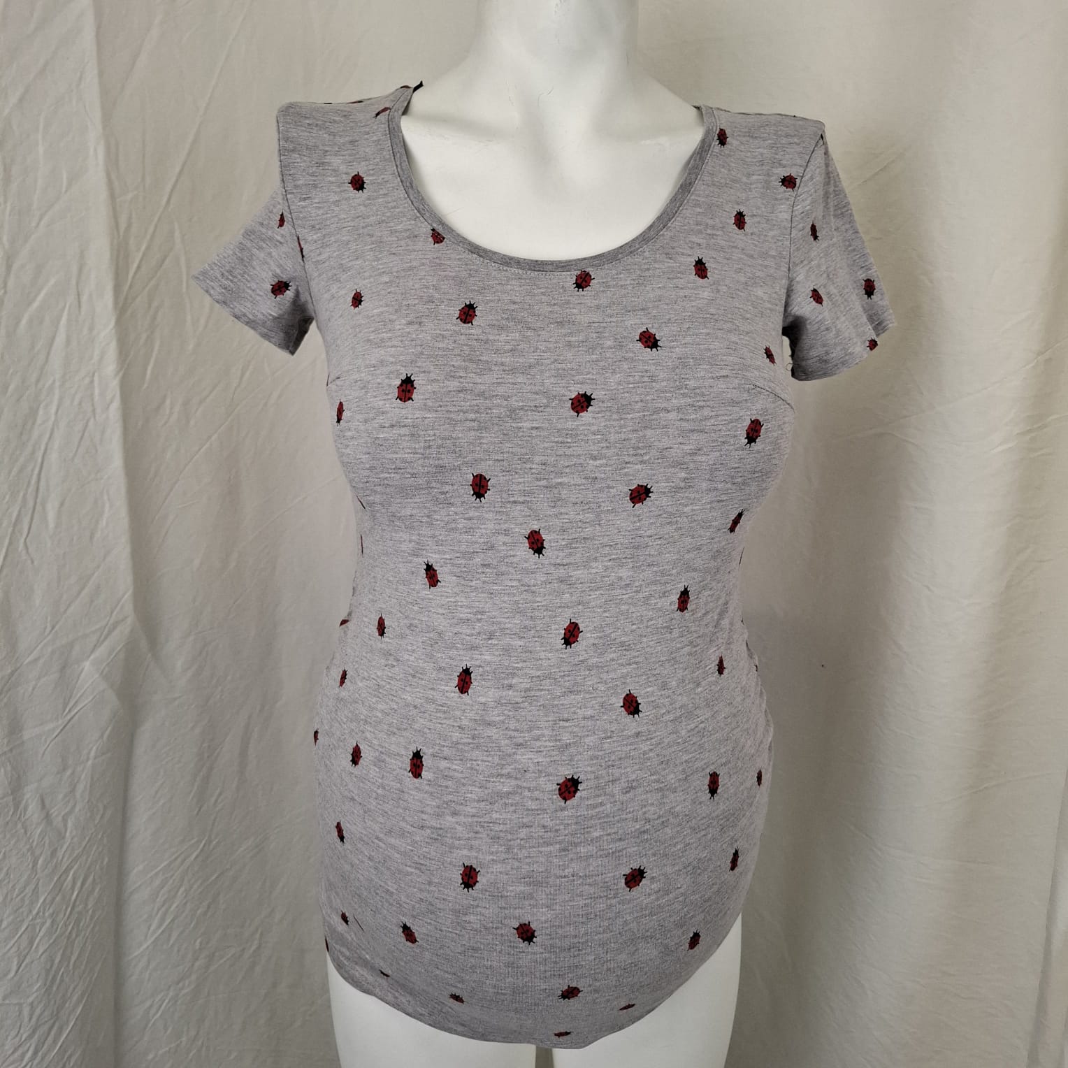 Autres commentaires : T-shirt manches courtes H&M Mama taille S gris avec motifs de coccinelle rouge