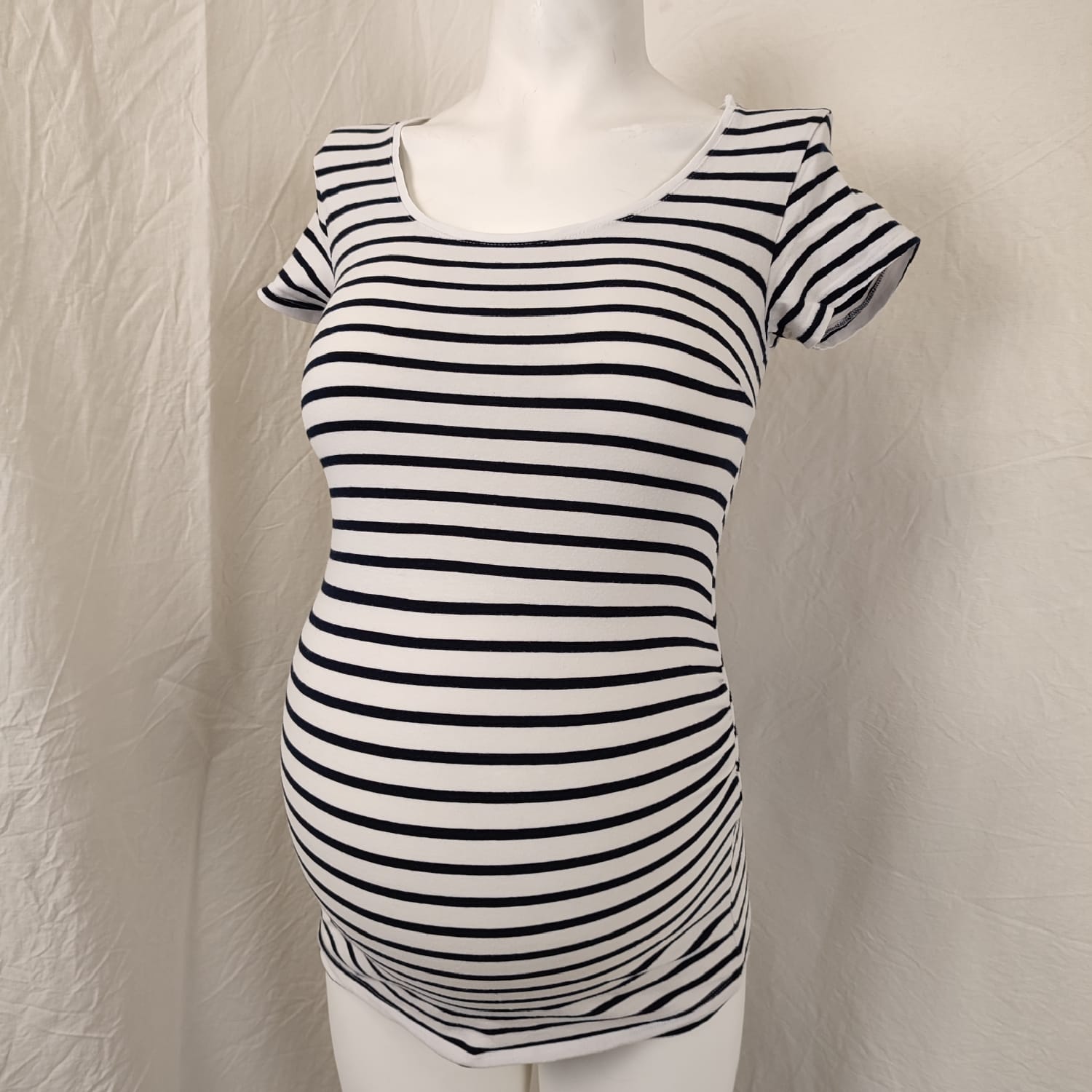 Autres commentaires : 5% élasthanne, T-shirt manches courtes blanc à rayures bleu marine, col rond, froncé su les côtés, arrondi en bas – taille S.