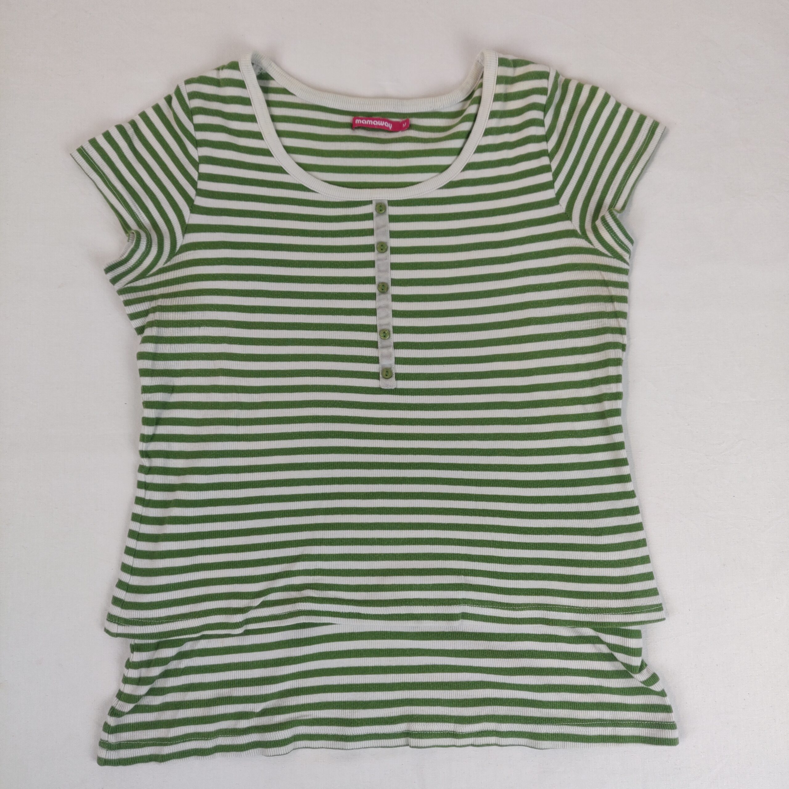 Autres commentaires : T-shirt vert rayé avec boutons de fermeture sur les côté pour l’allaitement. Contient 95% de coton , 5% de Spandex