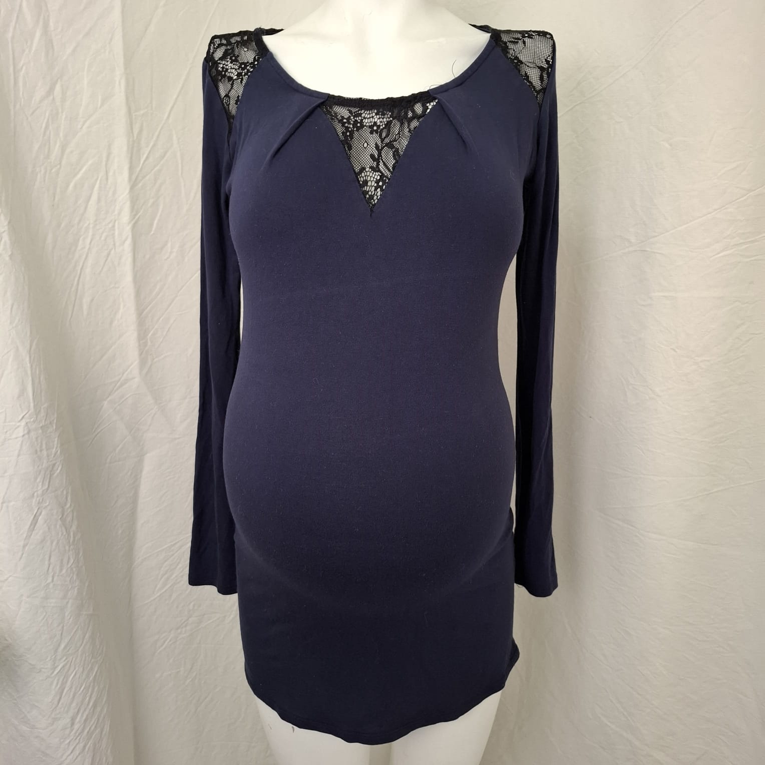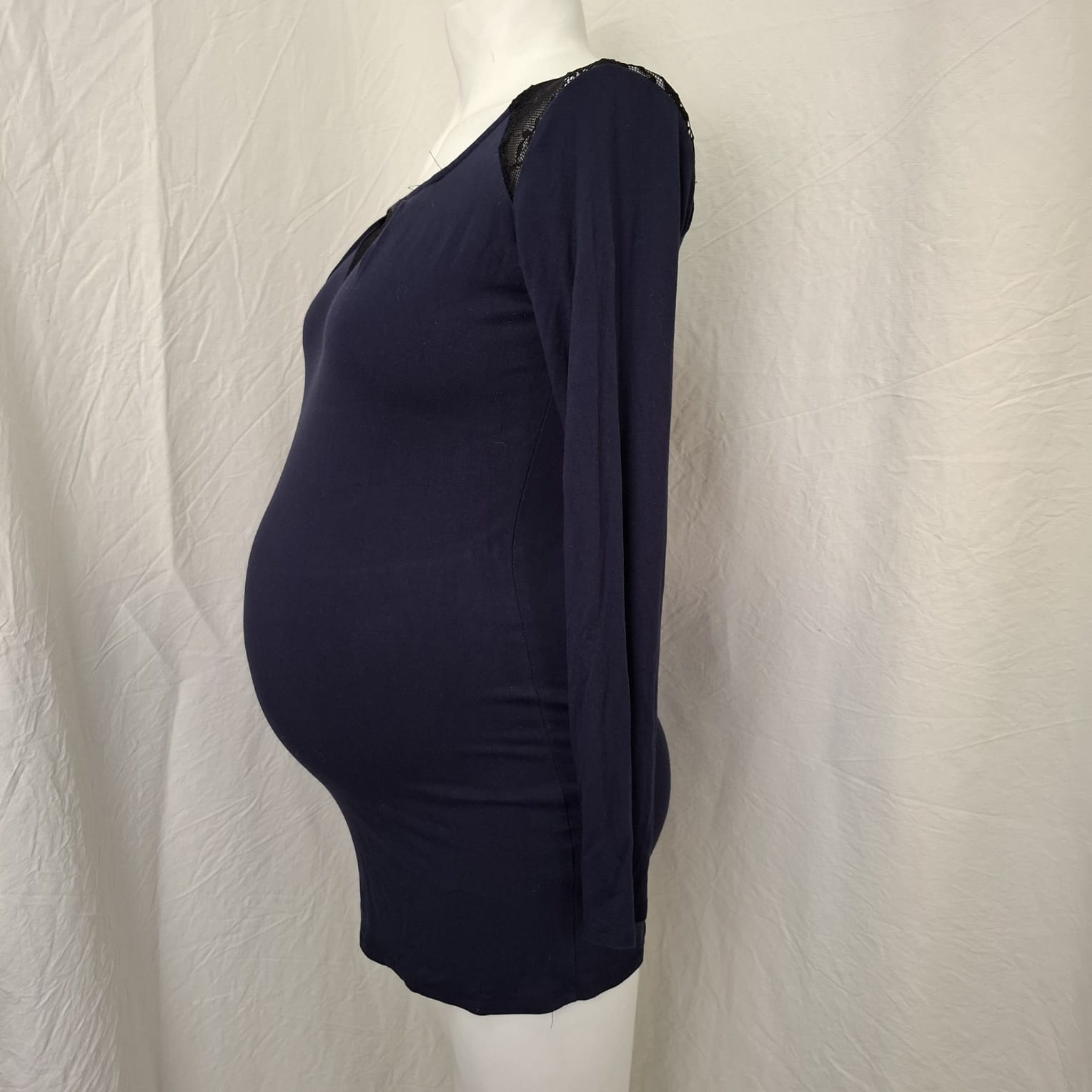Autres commentaires : T-shirt de grossesse bleu marine à manches longues, col rond, empiècements en dentelle autour du col, taille 36-38.