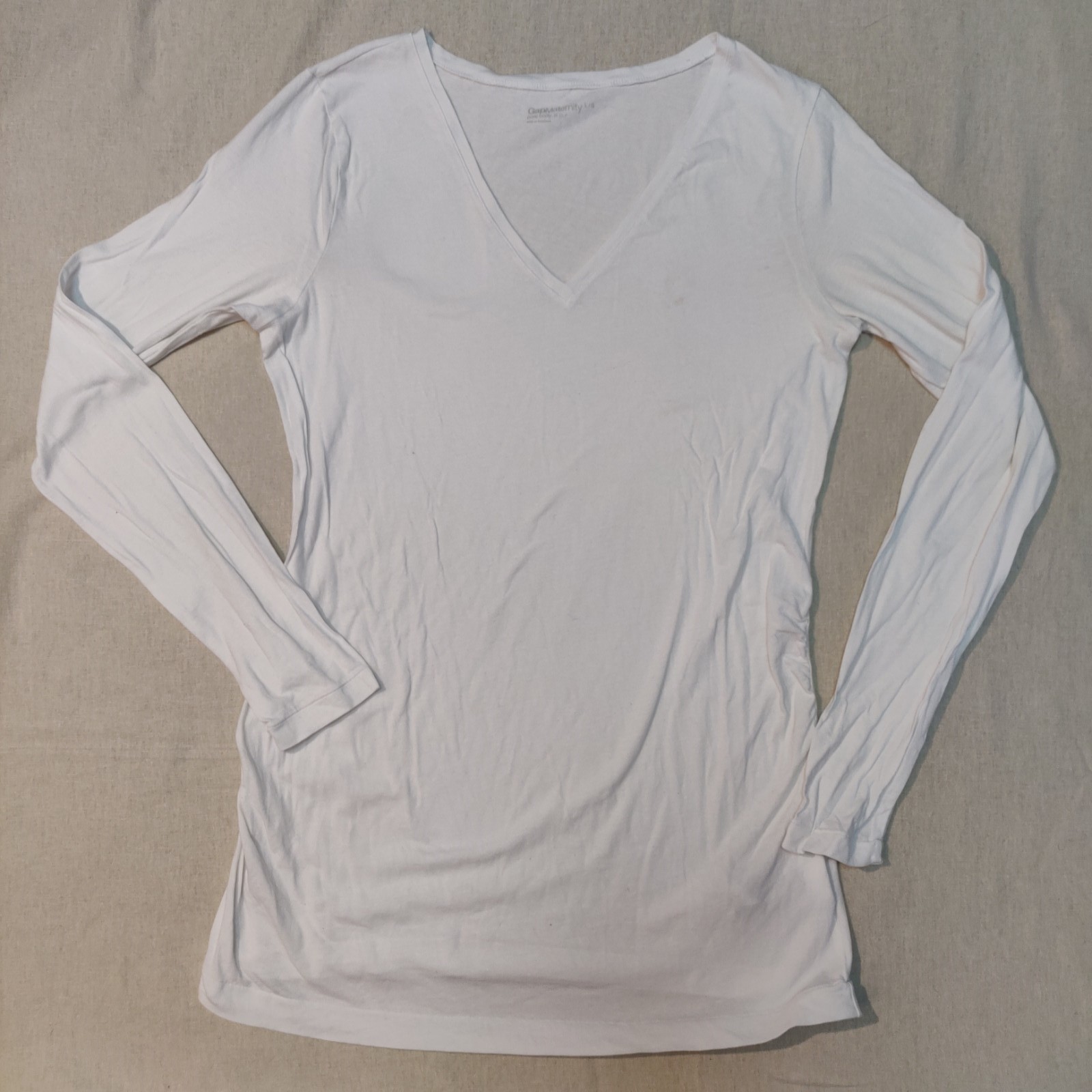 Autres commentaires : 7% Spandex. T-shirt blanc uni manches longues col V Pure Body. Froncé sur les côtés pour s’adapter au ventre.