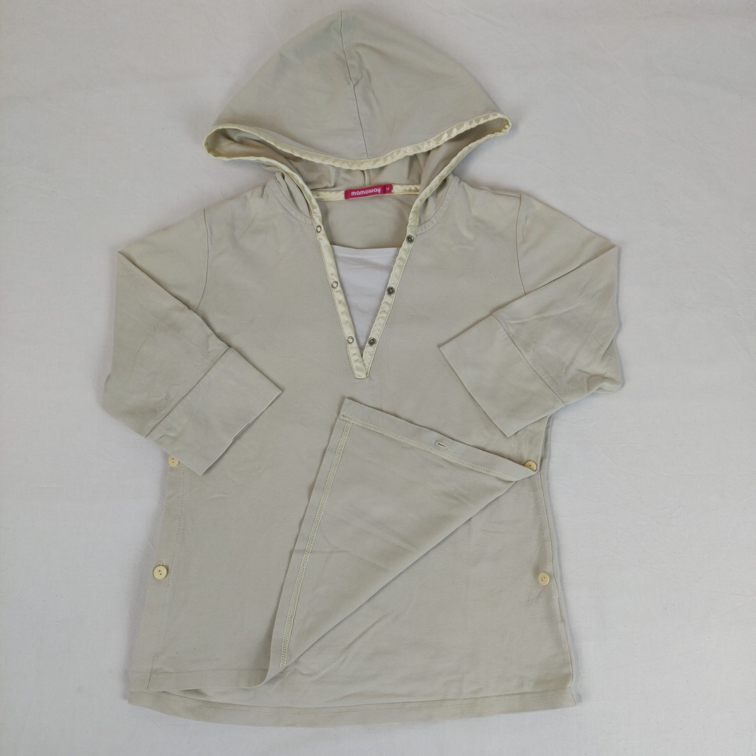 Autres commentaires : T-shirt manches longues d »allaitement à capuche beige avec fermeture par bouton pression au cou et ouverture pour allaitement à bouton simple au niveau des deux cotés . Contient 95% de coton 5% de Spandex et doublé à l interieur.
