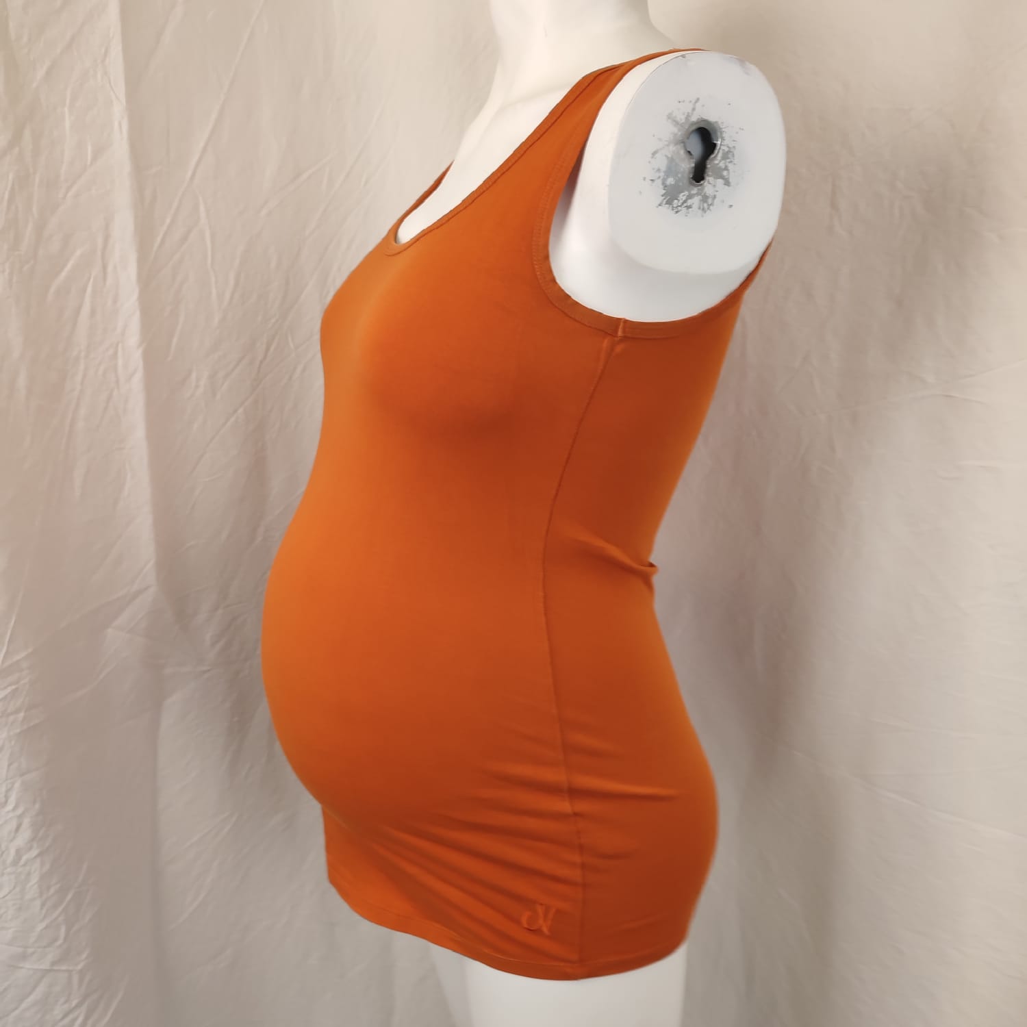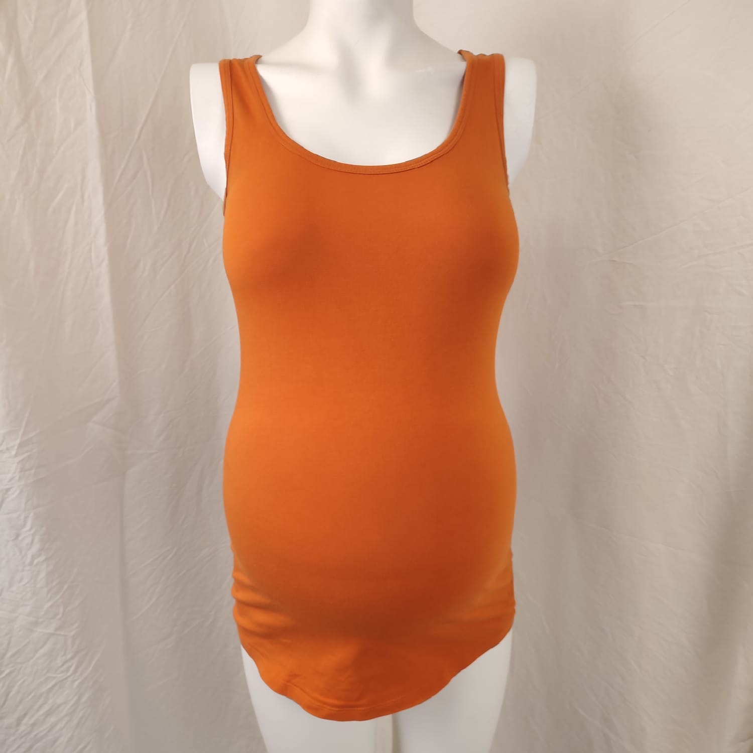 Autres commentaires : 5% élasthanne. T-shirt sans manche uni orange, encolure large ronde. Taille S.