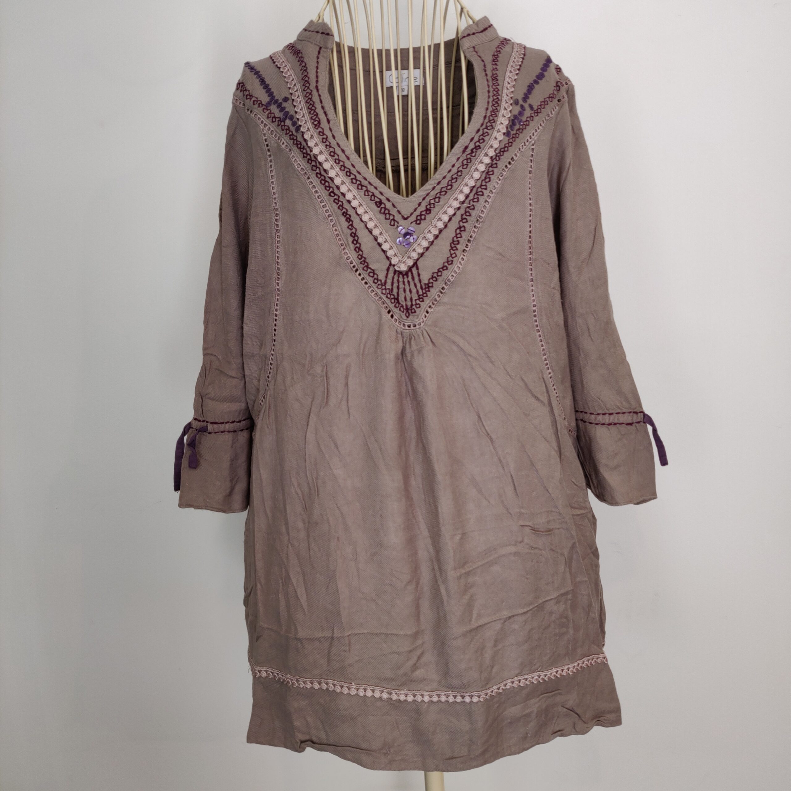 Autres commentaires : Tunique bohème taupe – broderies et sequins violets – Col V – manches 3/4