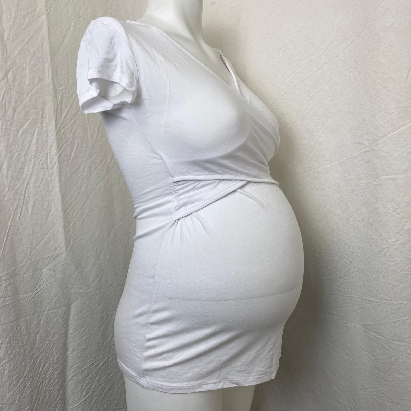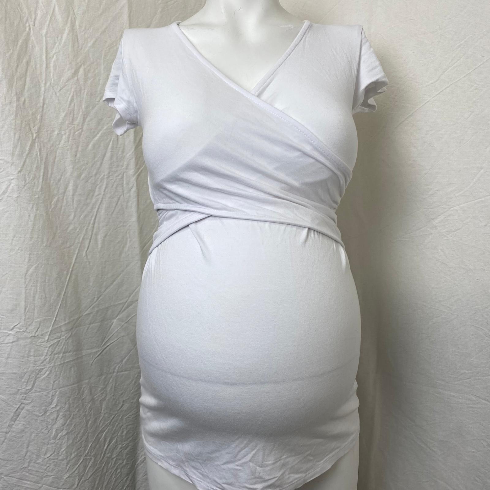 Autres commentaires : 4% élasthanne. Haut blanc uni de maternité et d’allaitement, manches courtes, fermeture croisée devant.