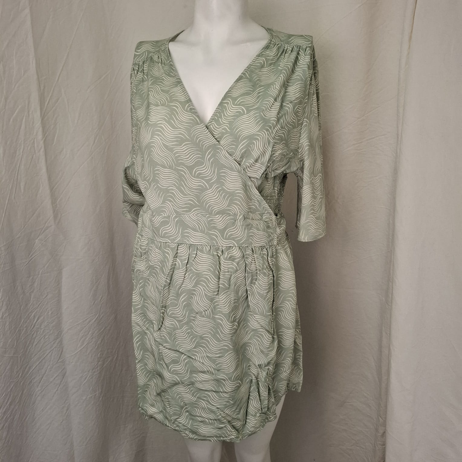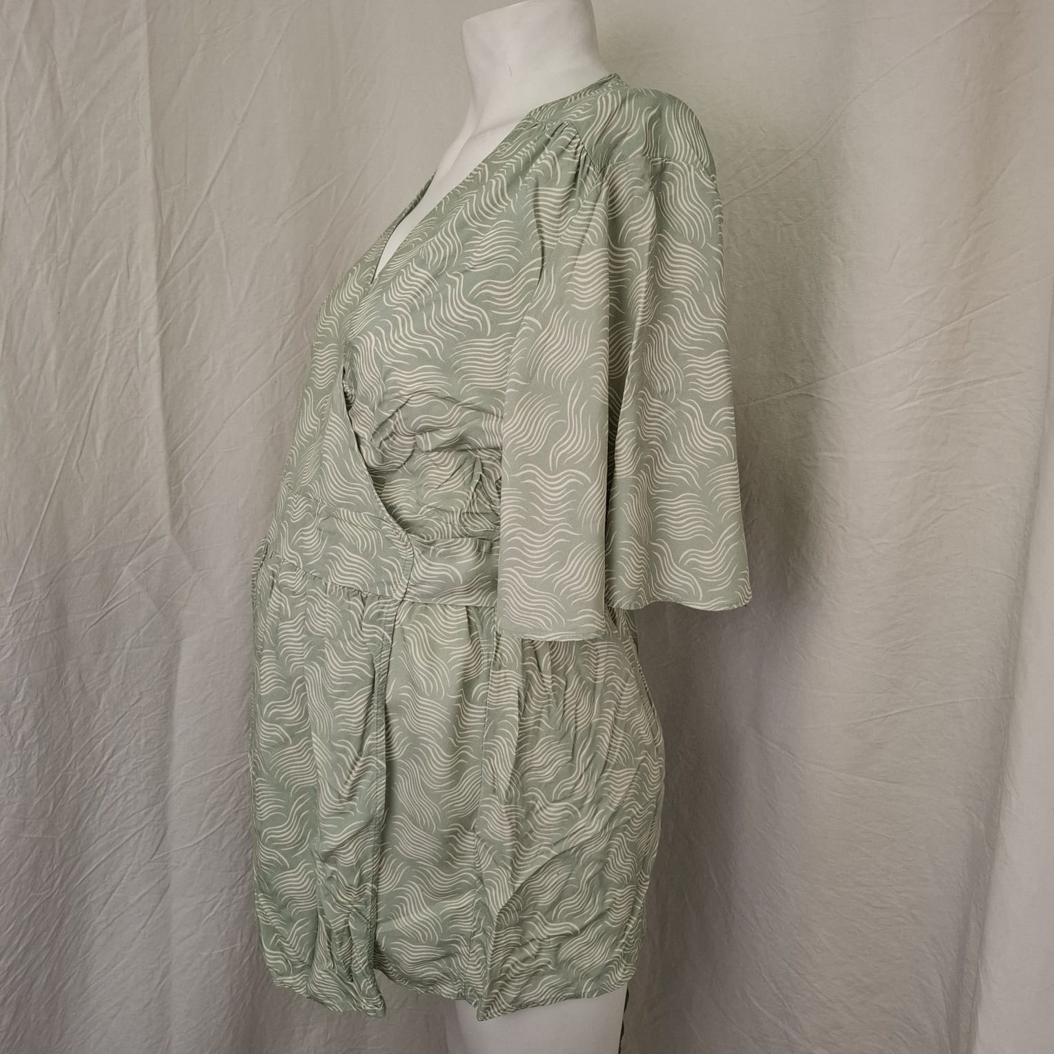Autres commentaires : Tunique portefeuille fluide, vert d’eau et motifs vaguelettes blanches. Permet l’allaitement