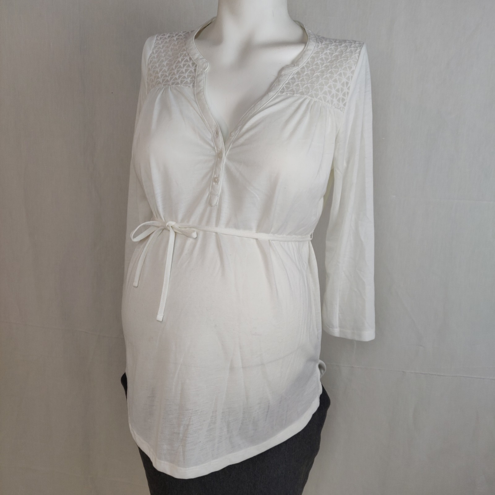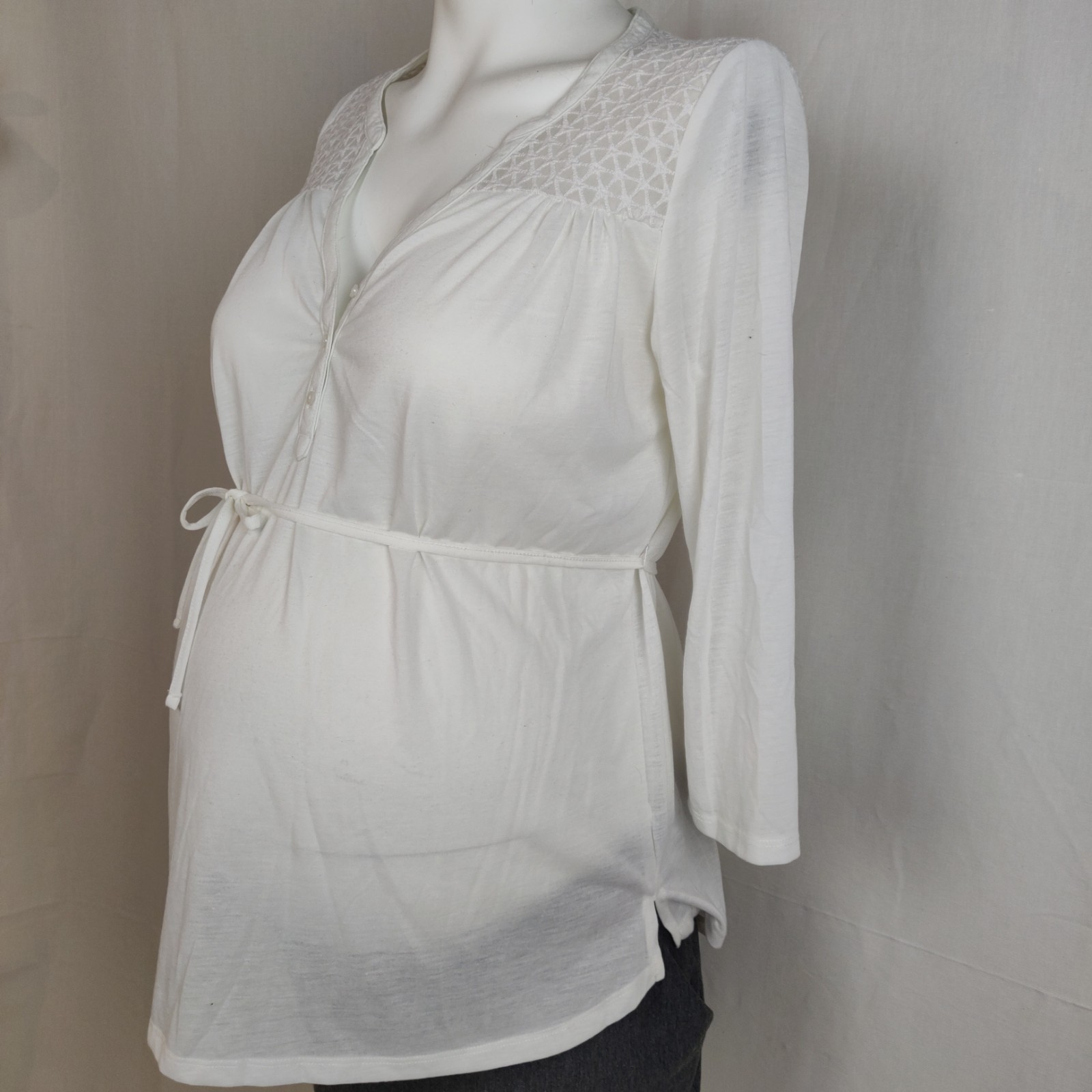 Autres commentaires : Tunique écrue col V à boutons nacrés, ceinture, haut ajouré.