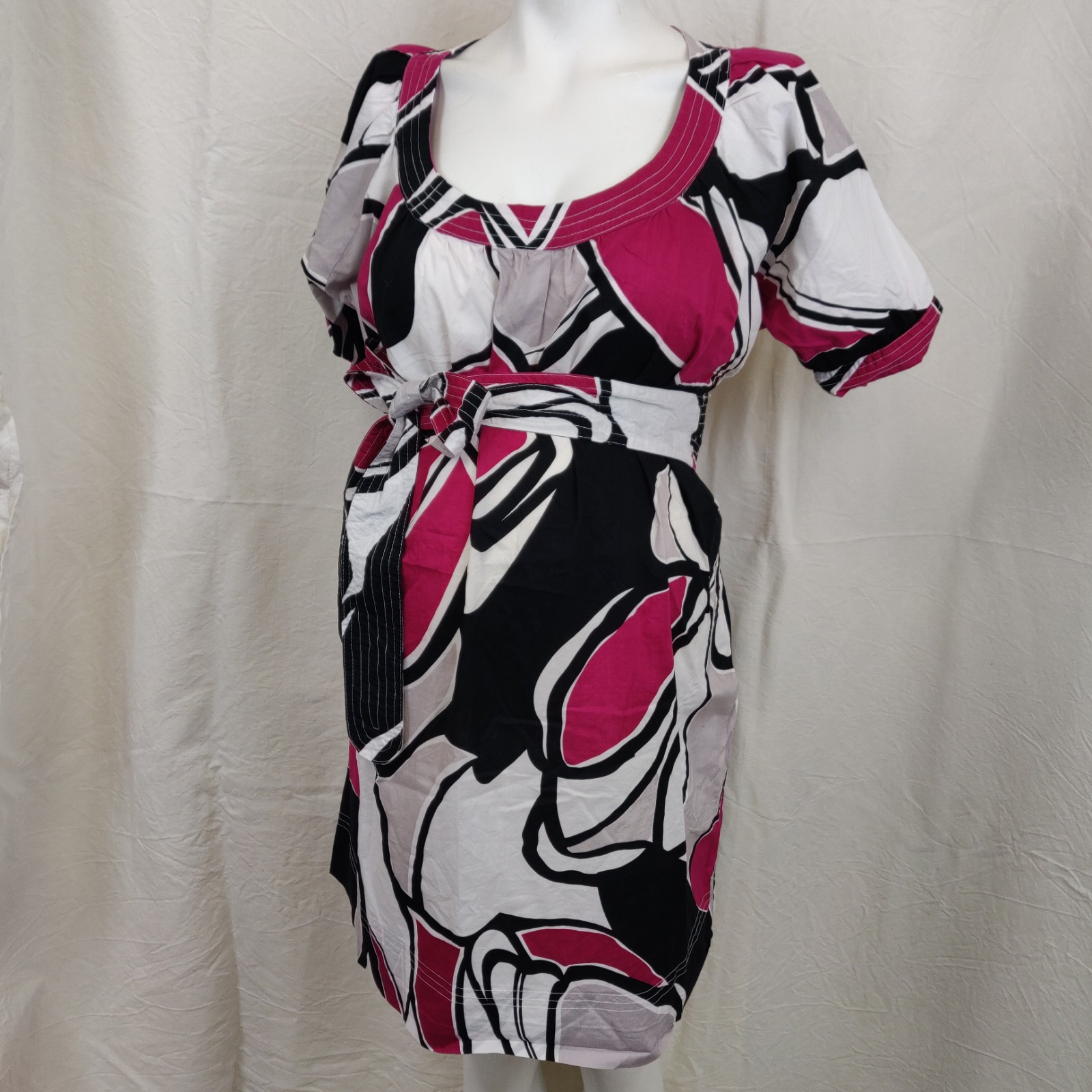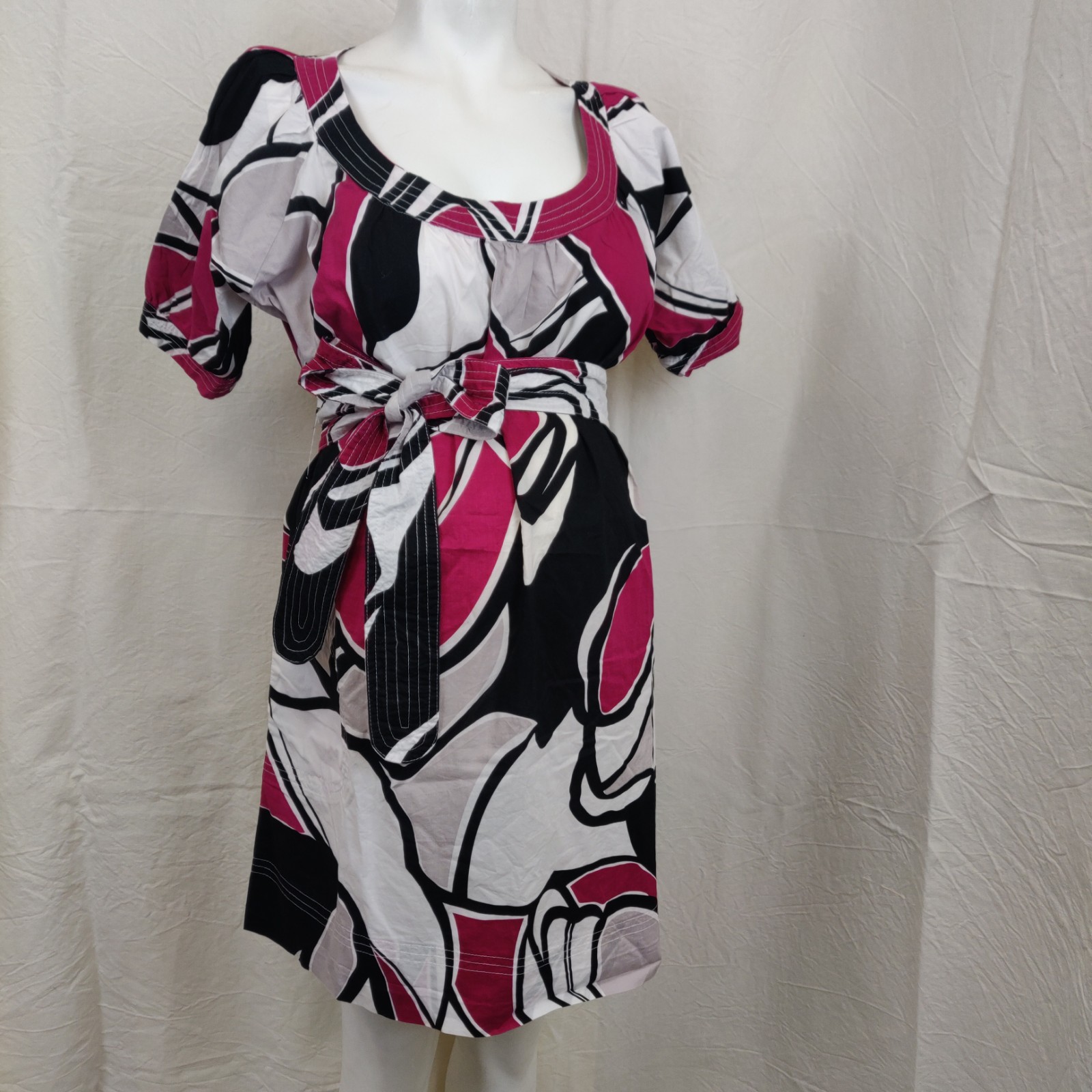 Autres commentaires : Tunique à motifs géométriques rose fuschia, noir et gris sur fond blanc. Manches courtes et col évasé. Ceinture amovible. Taille très ample – taille S