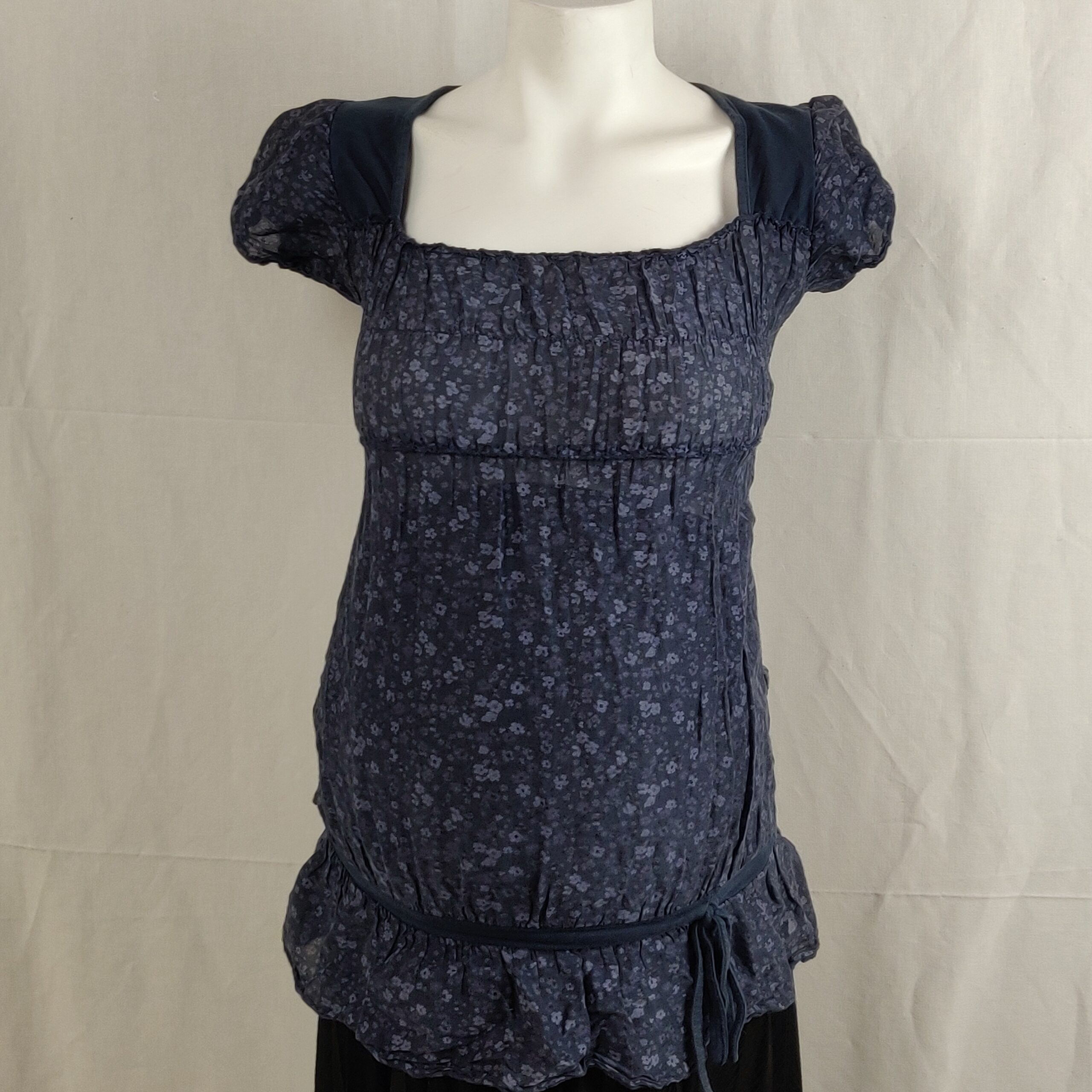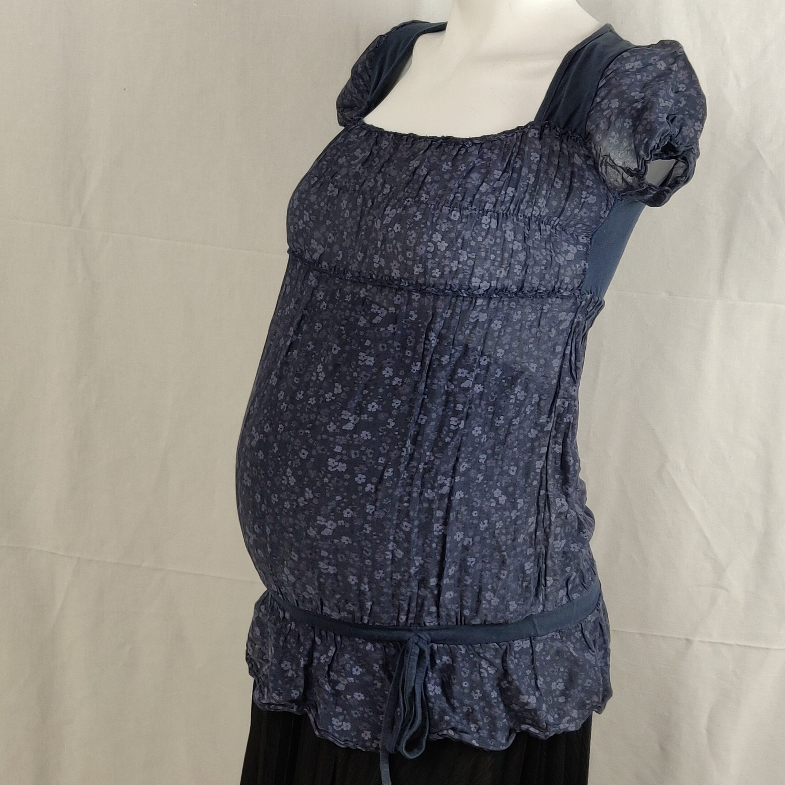 Autres commentaires : Coton 50%. Tunique à manches courtes – noir-gris avec motifs floraux parmes et gris.