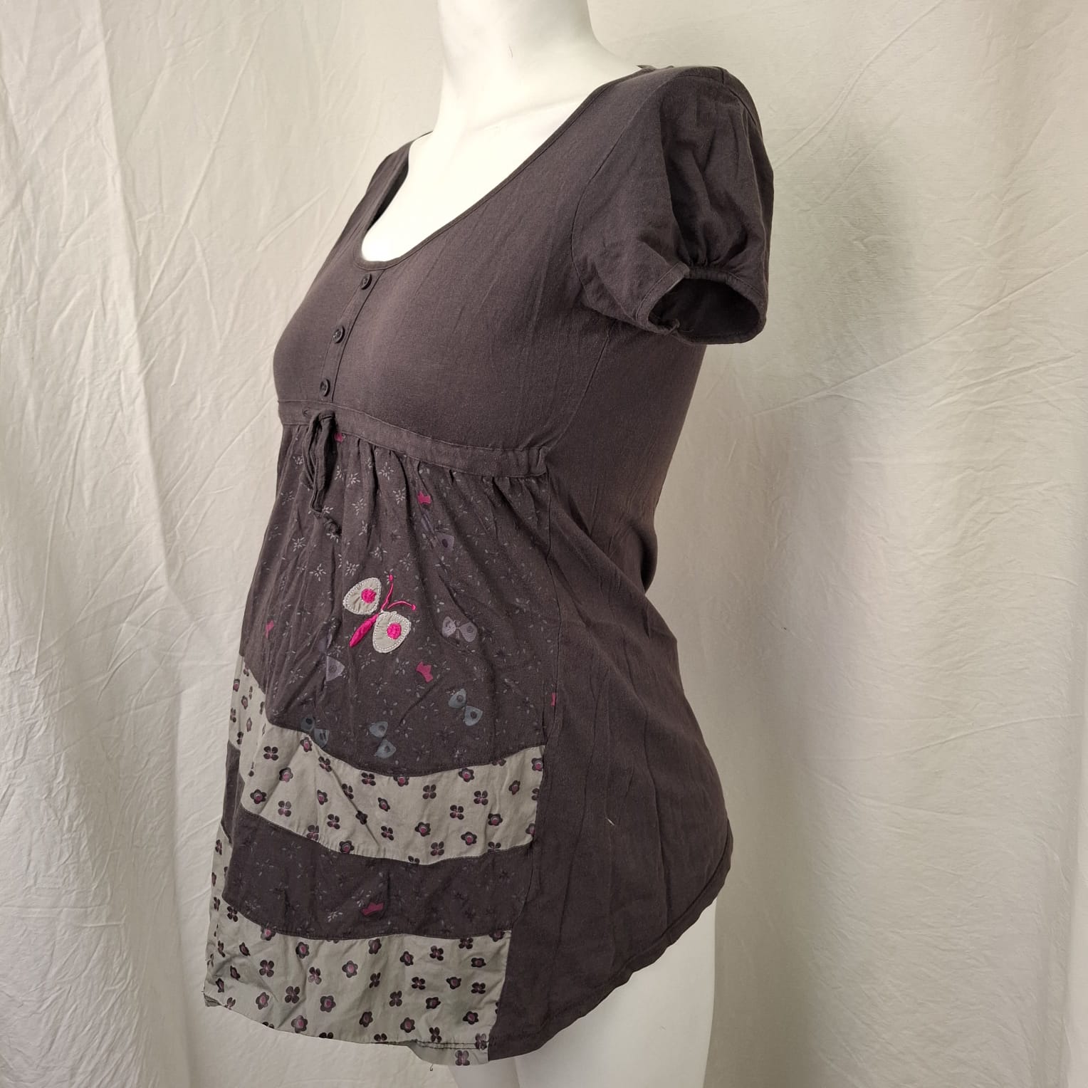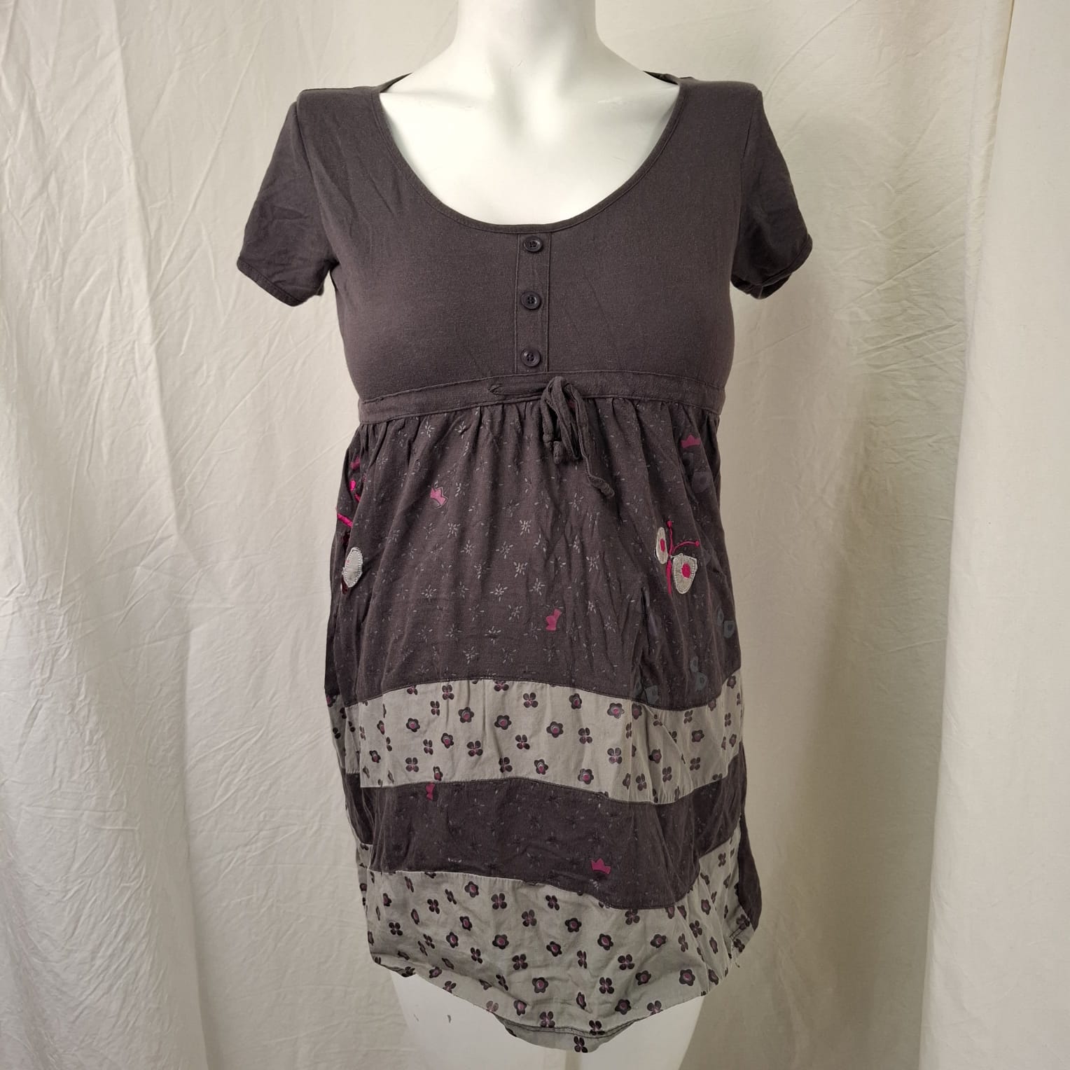 Autres commentaires : Tunique de maternité marron à manches courtes style ballon, col avec décolleté arrondi, taille empire froncée et ajustable par lanières à nouer devant, devant en bas, motifs fleurs et papillons roses et gris. Taille estimée 38.