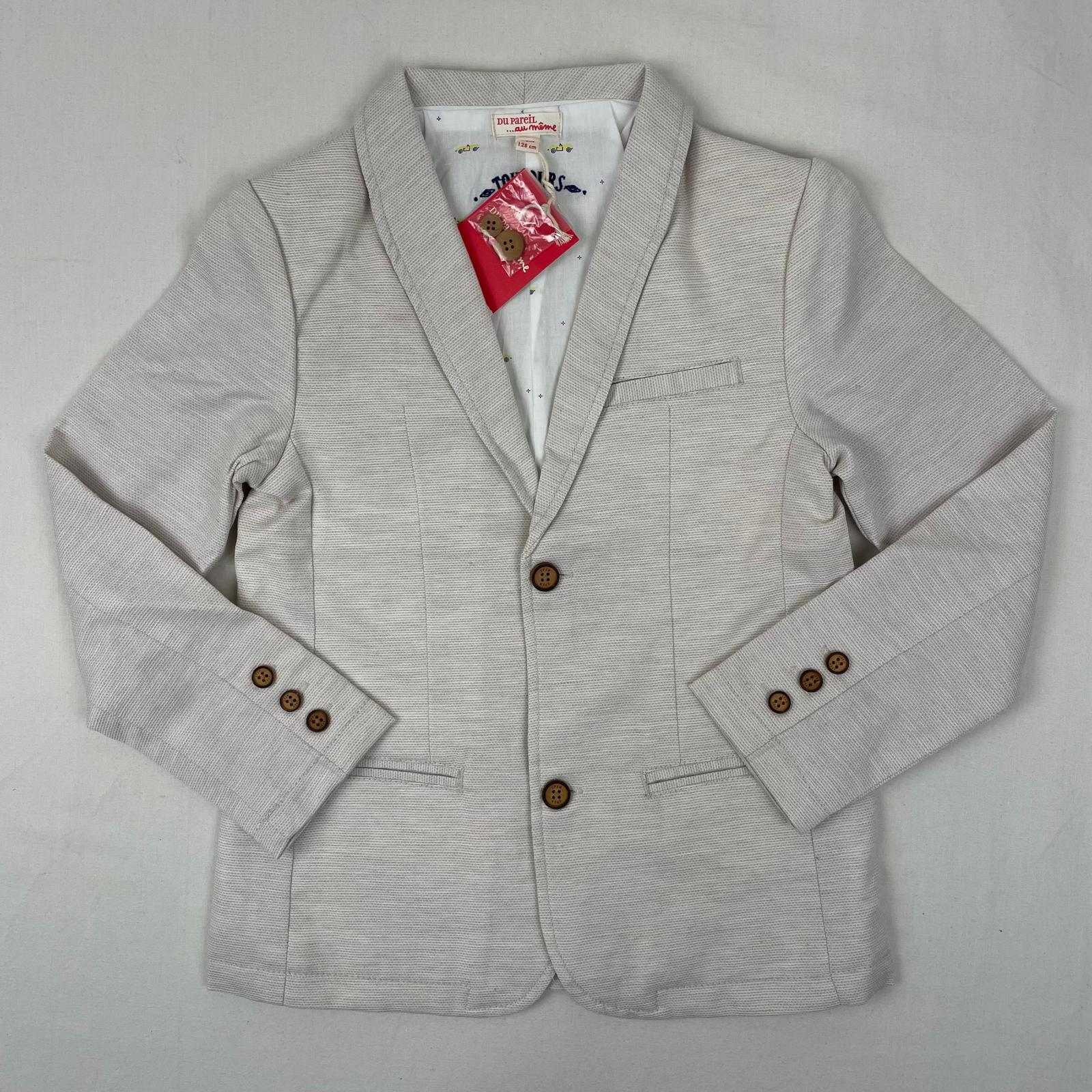 Autres commentaires : Tissu exterieur: 42% polyester, 27% Lin; Doublure: 100% coton. Veste de costume beige avec doublure blanche à motif de petite voiture et inscription « TOUJOURS, de père en fils, chic. Fermeture par bouton classiques.