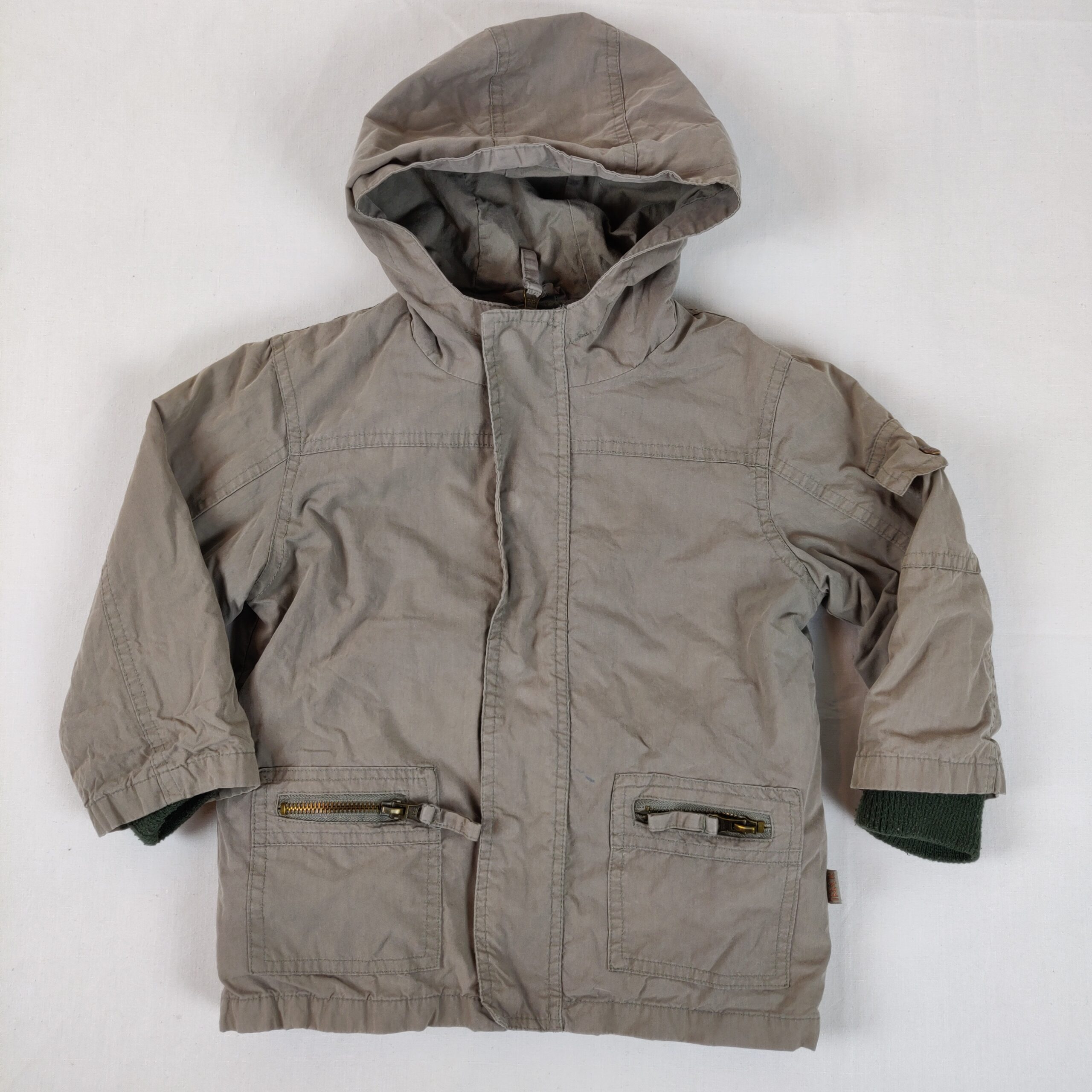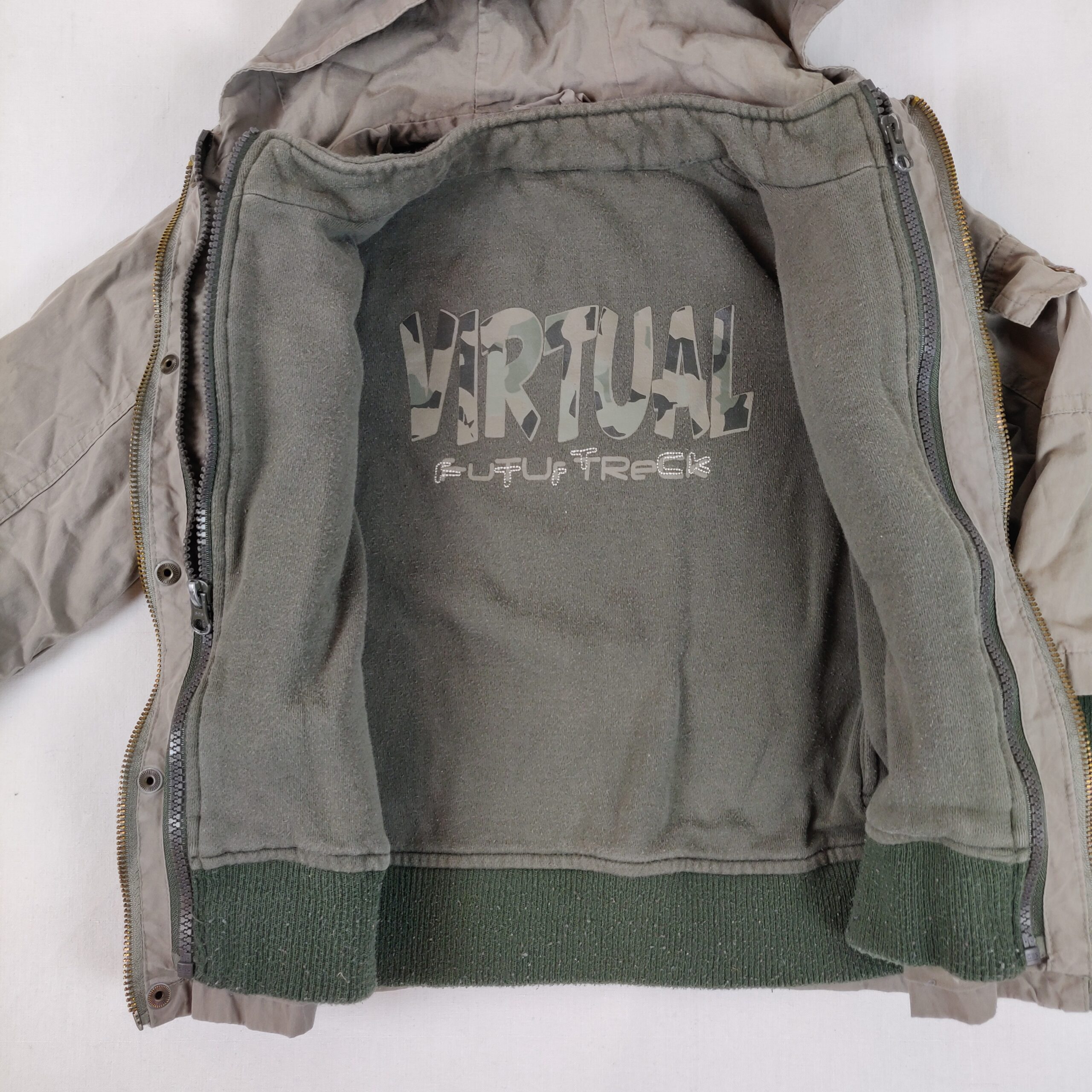 Autres commentaires : 35% polyamide. Blouson à capuche avec gilet amovible – vert kaki clair. Ouverture centrale zippée métallique sous rabat pressionné. 2 poches latérales à zip. 1 poche à rabat au niveau du haut de la manche gauche. Gilet interne amovible – vert kaki avec inscription centrale au dos « Virtual Futur Treck ». 2 poches latérales. Fermeture à zip. Usure normale du vêtement.