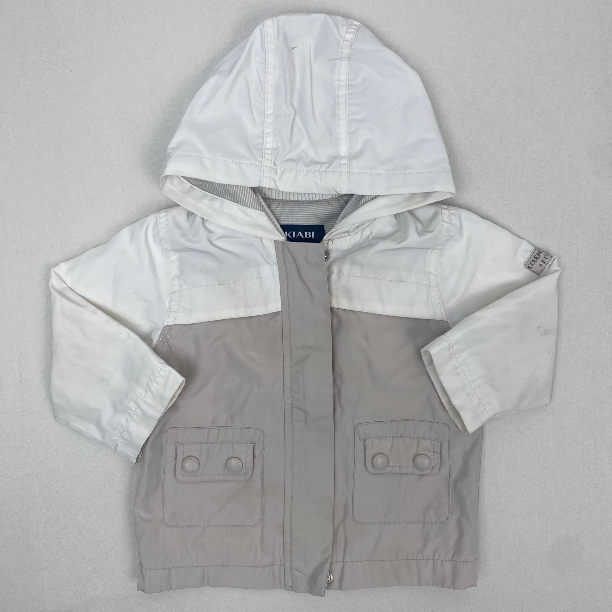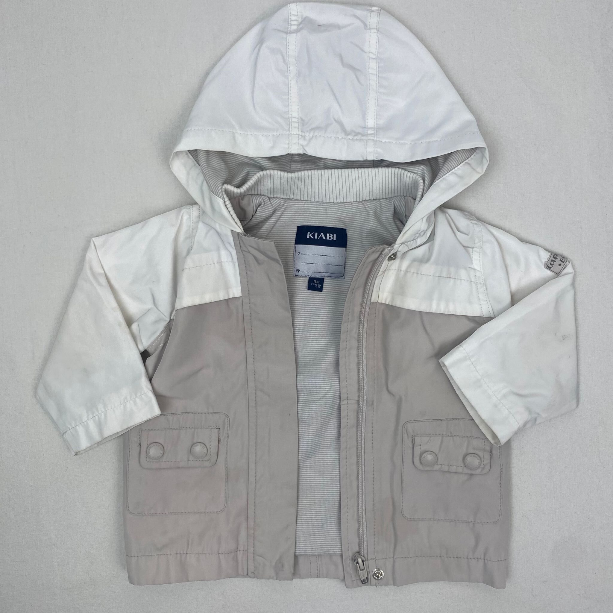 Autres commentaires : Blouson beige blanc à maches longues et capuches, fermeture devant par zip et 2 boutons pression avec 2 poches.