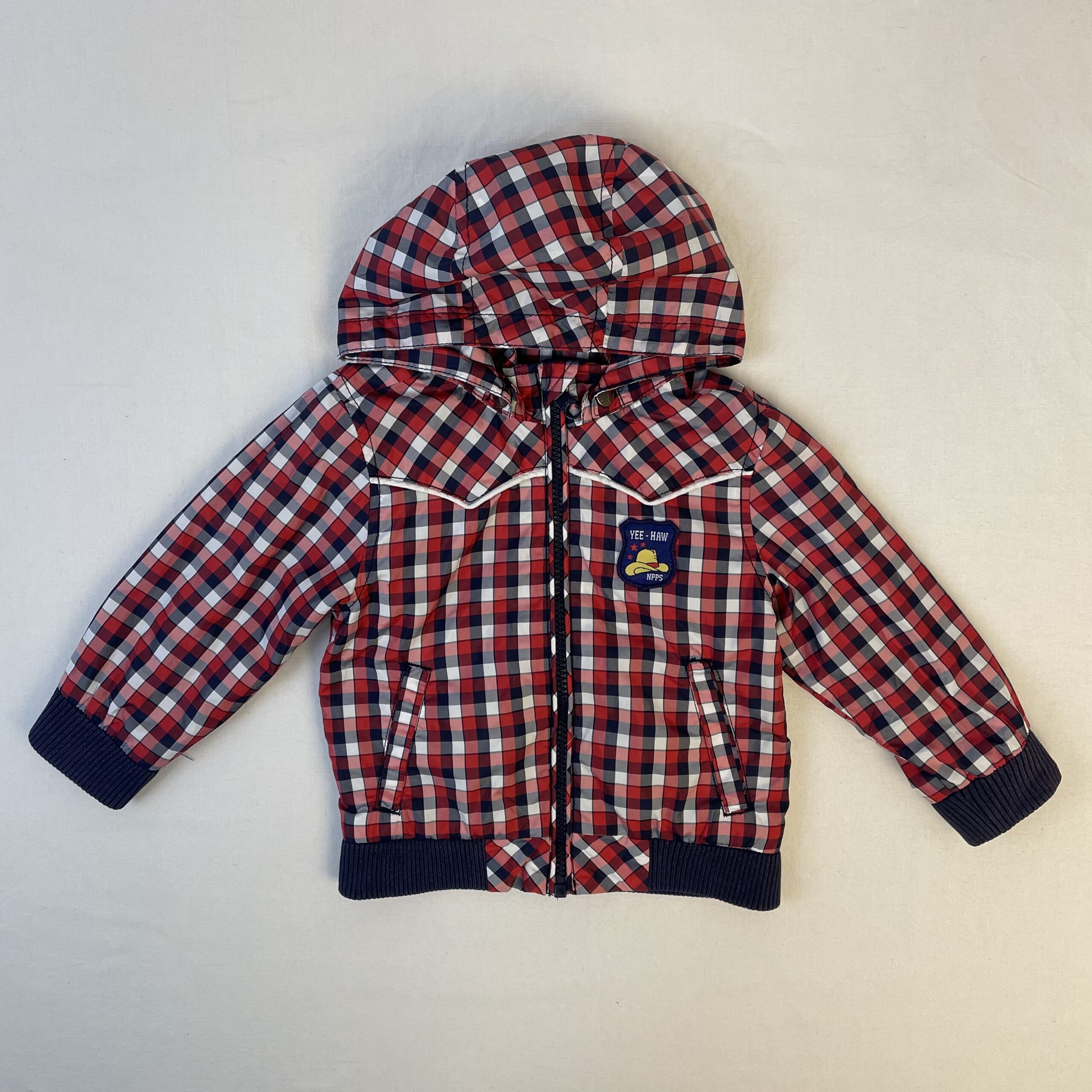 - Blouson léger zippé à capuche amovible par boutons pression, à carreaux bleu marine, rouges et blancs, deux petites traces roses en bas à l’intérieur non visibles.