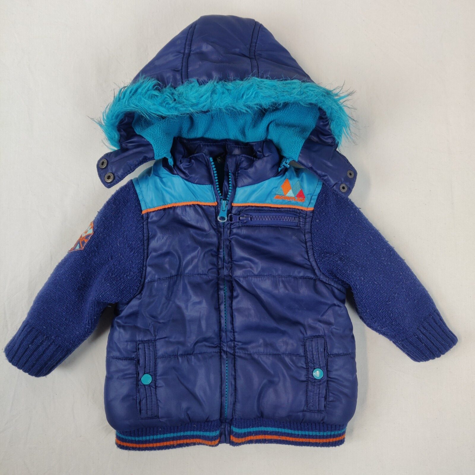 Autres commentaires : Blouson doublé en polaire à capuche – bleu. Les manches sont en mailles bleu marine. Motifs centraux montagnes accompagnés de l’inscription « Mountains ». Ouverture centrale zippée. Une pochette centrale zippée. 2 poches latérales. Fourrure synthétique bleue sur le rebord de la capuche. Usure normale du vêtement.
