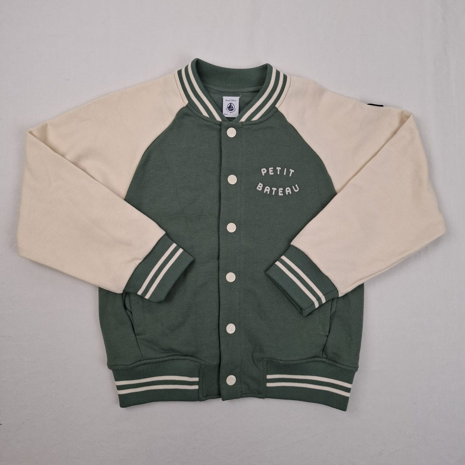 Autres commentaires : Veste chaude de demi-saison, beige crème et vert croco, style teddy, fermeture devant par boutons pression, col, poignets et bas côtélés, rayés et élastiqués.