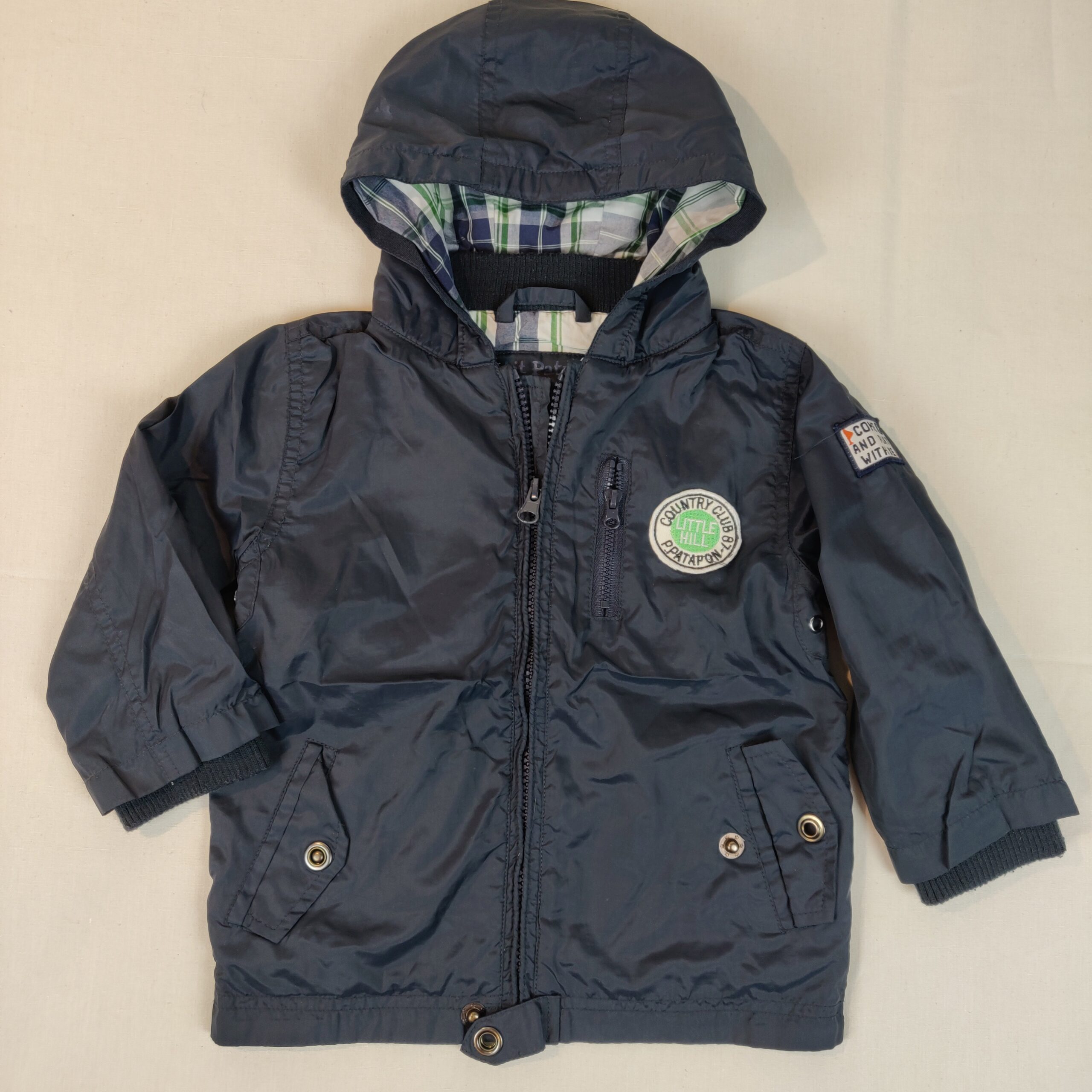 Autres commentaires : Blouson à capuche – tissu imperméable bleu marine. Doublure Coton 100% à quadrillage bleu et vert. 2 poches avec bouton pression. 1 poche poitrine à fermeture éclair. Fermeture éclair centrale sur le devant . 1 écusson sur la poitrine et un autre sur le bras gauche.
