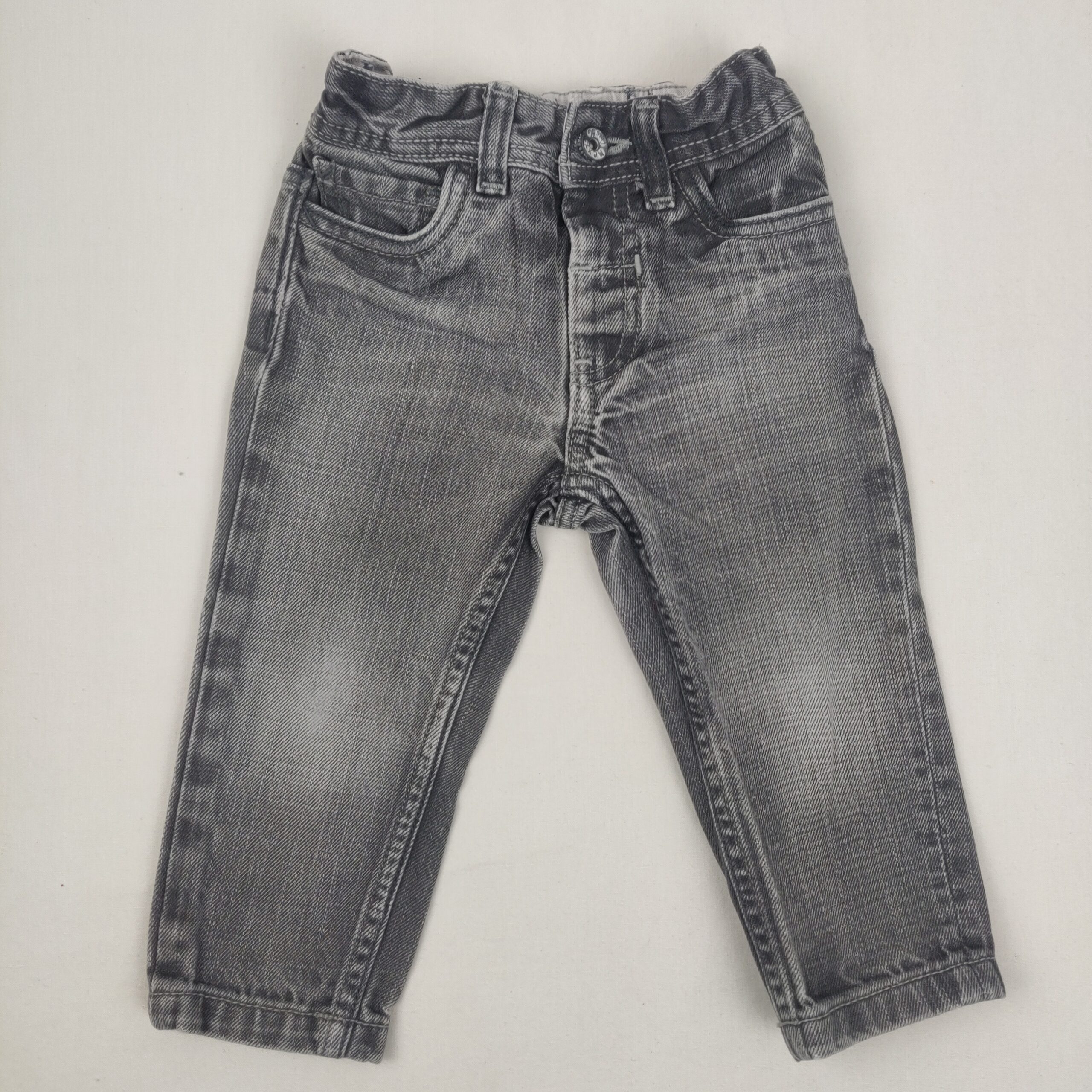 Autres commentaires : Jeans gris, fermeture bouton et taille élastiquée.