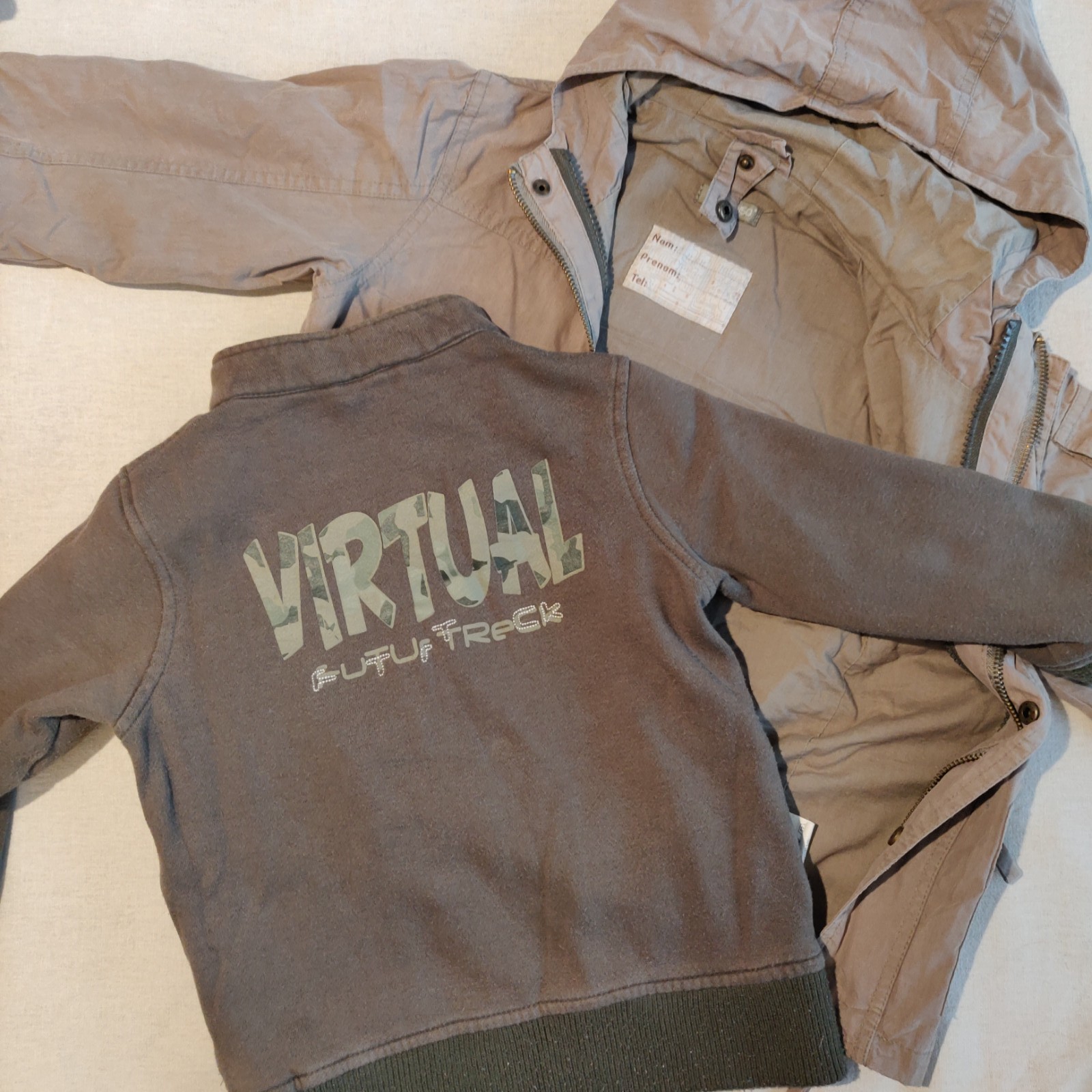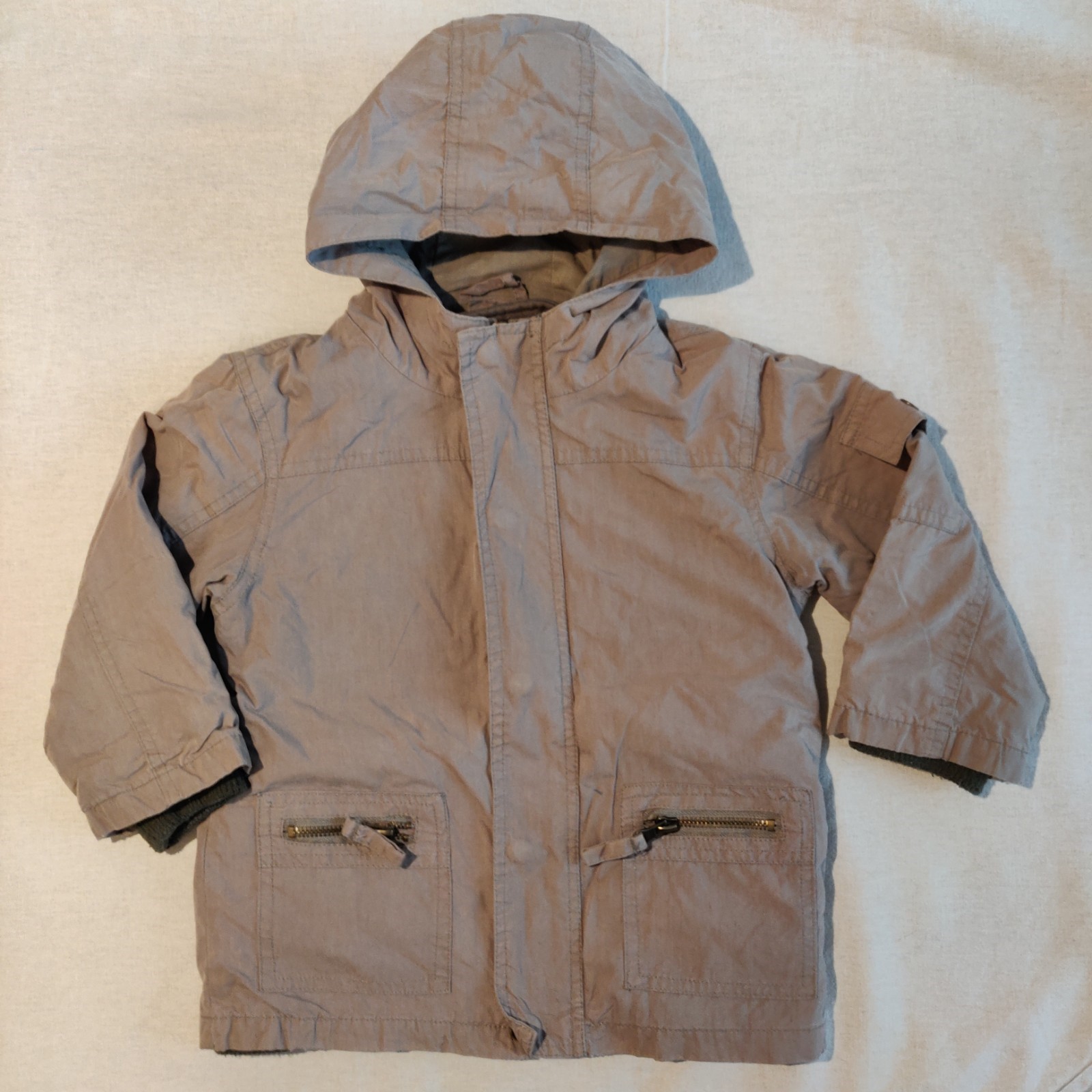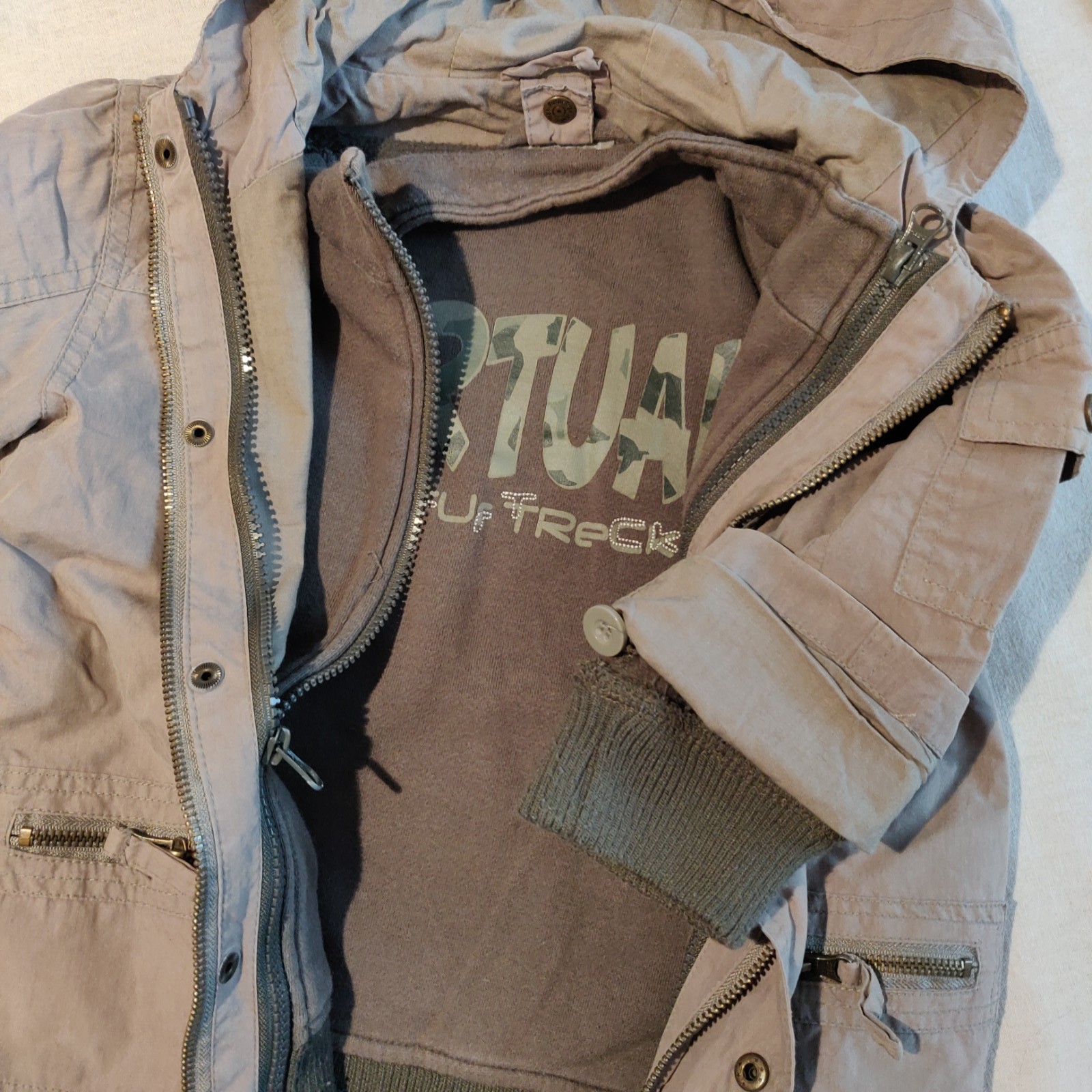 Autres commentaires : Extérieur 35% polyamide, veste intérieure 20% polyester. Parka kaki clair doublée d’un gilet autonome kaki. Fermeture par zip et boutons pression, le gilet s’accroche par zips des deux côtés, un bouton pression au cou et des boutons aux manches. En très bon état, excepté une petite trace de feutre bleu à la taille. Niveau réduit de Fraise à Myrtille pour cela.