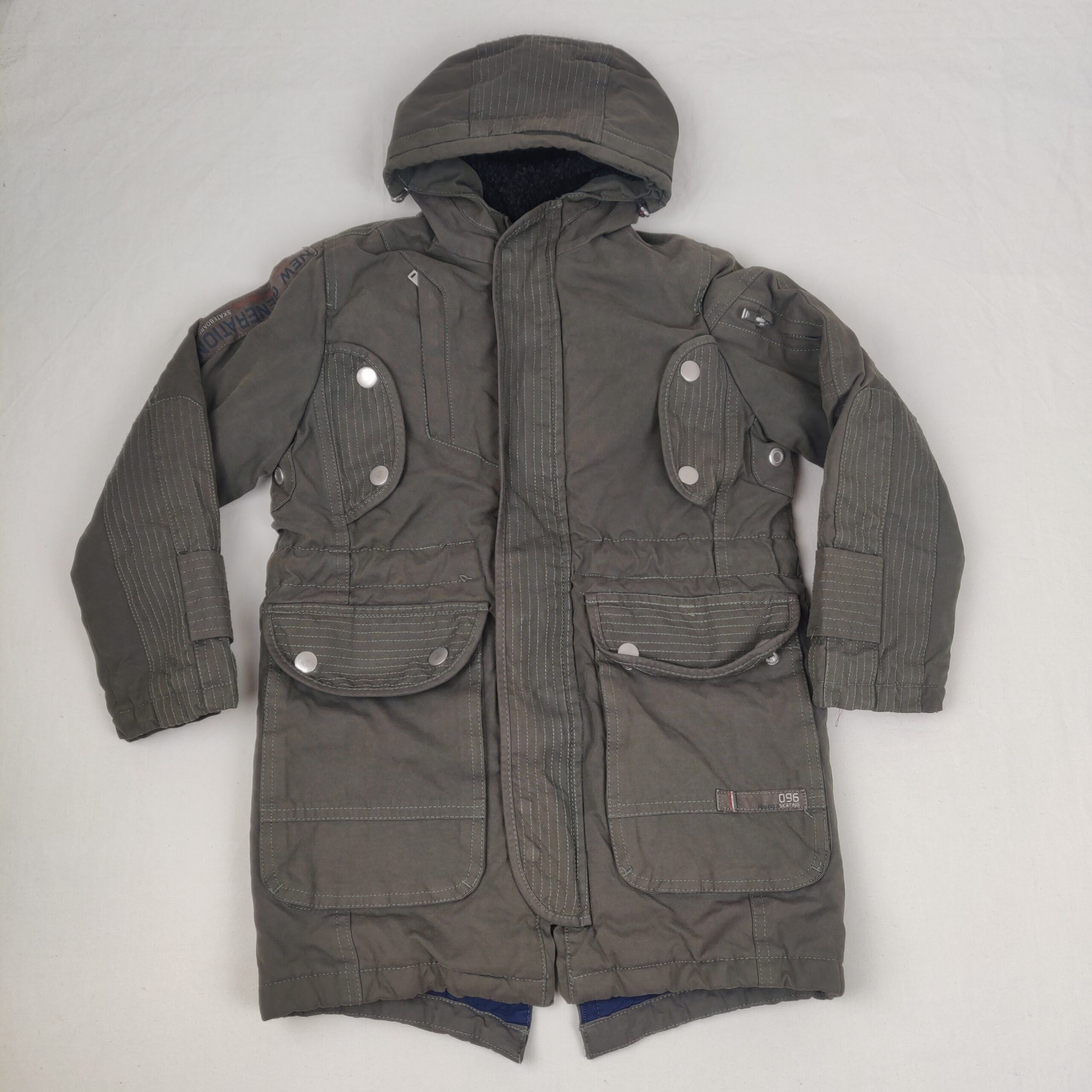 Autres commentaires : Parka kaki à capuche, intérieur matelassé, fermeture à zip doublée de boutons pressions. Doublue polyester
