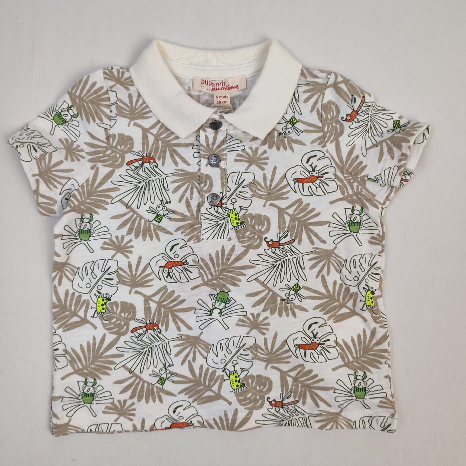 Autres commentaires : Polo manches courtes de couleur crème avec des motifs feuillage beige et inseces colorés, fermeture par boutons pression a l’avant