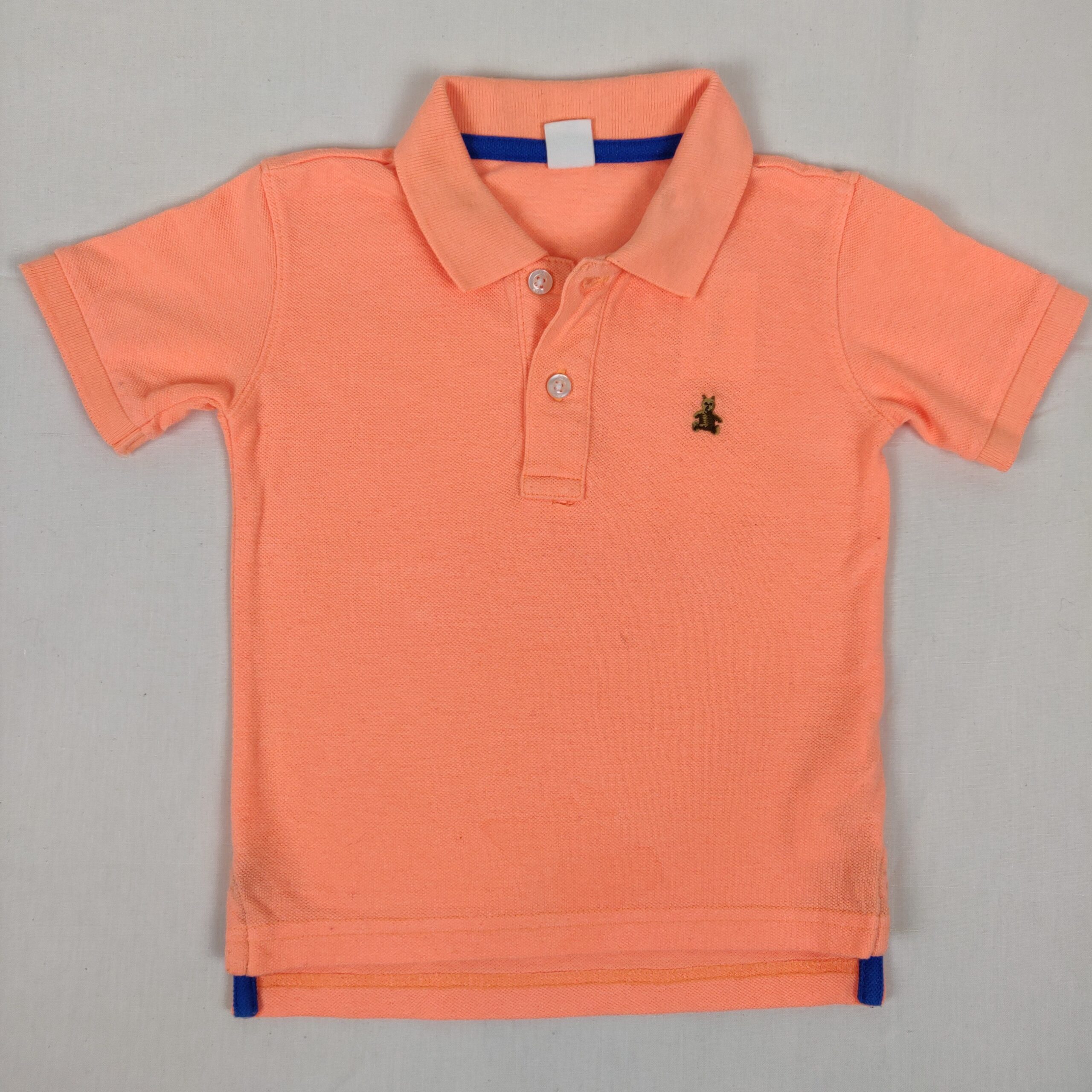 Autres commentaires : 48% polyester. Polo orange, ours marron brodé au coeur, revers bleu roi. Quelques traces d’usage discrètes.