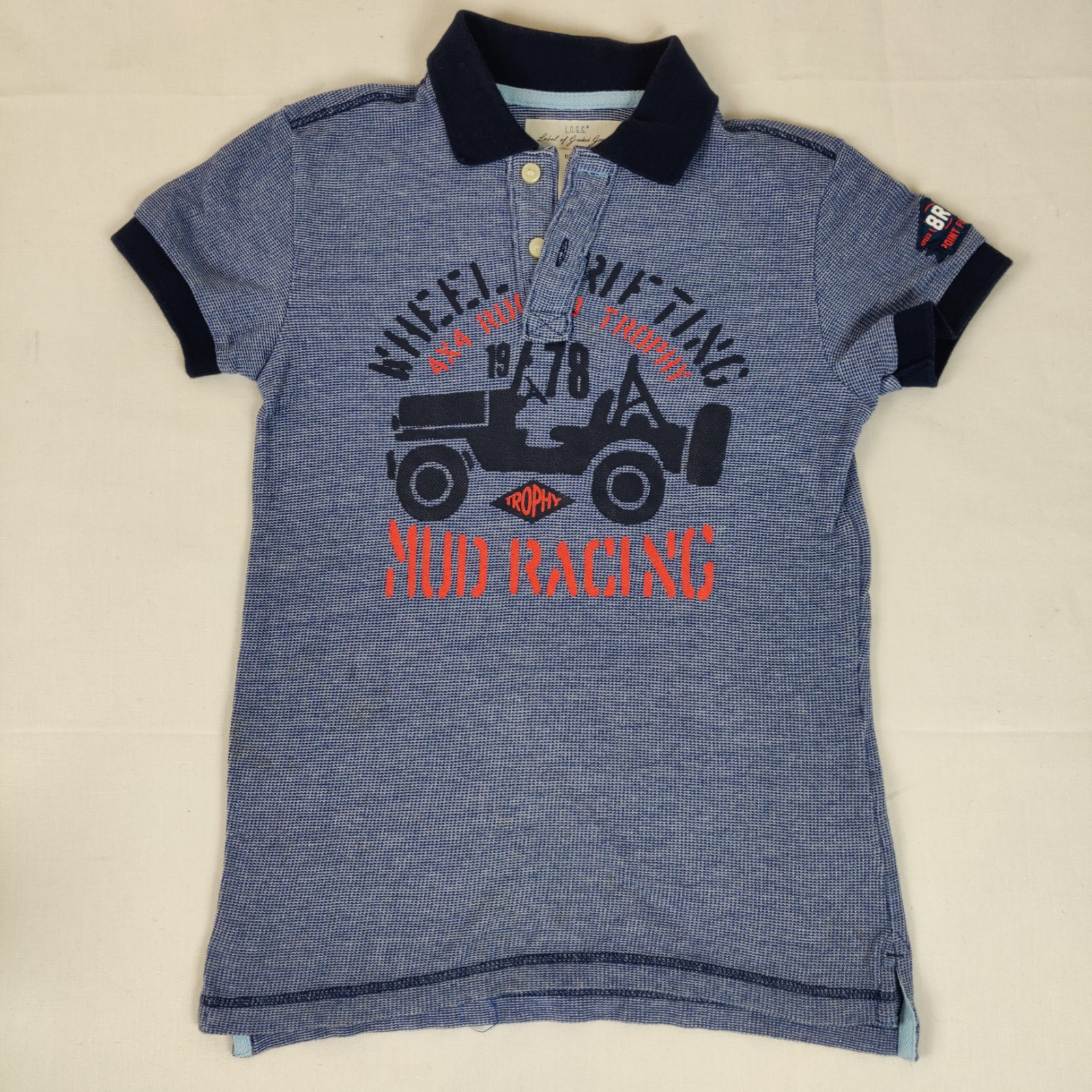 Autres commentaires : Polo à manches courtes – fils de coton mêlé écru et bleu marine. Motif central Jeep bleu marine avec inscription orange et bleu marine « Wheel rifting. 4X4 Trophy. Mud racing ». Ouverture centrale à 2 boutons classiques. Col et rebords de manches bleu marine. Ecusson coloré cousu sur la manche. Echancrures latérales à la taille.