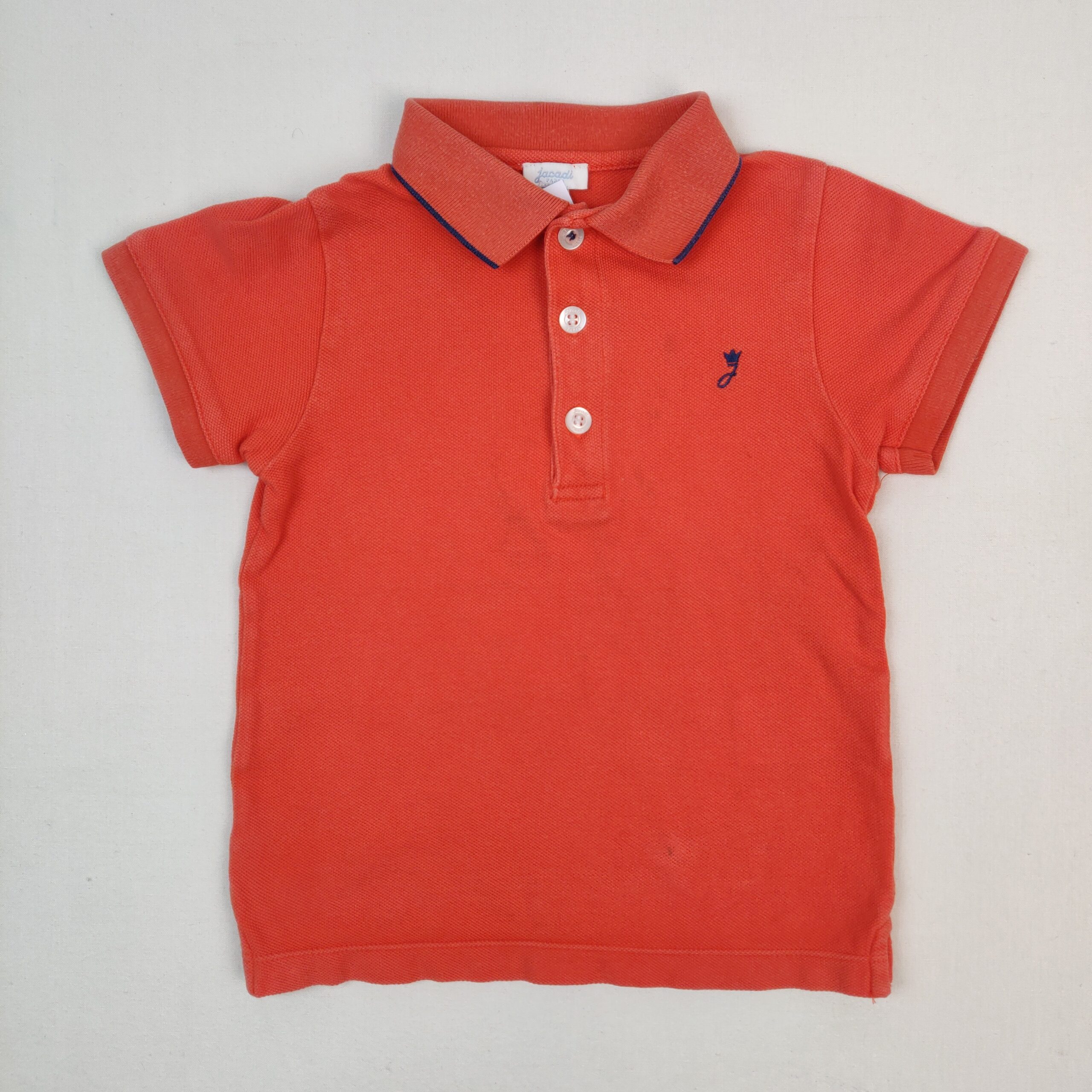 Autres commentaires : Polo manches courtes orange citrouille, col polo, fermeture pas boutons classiques, minuscule tache en bas.