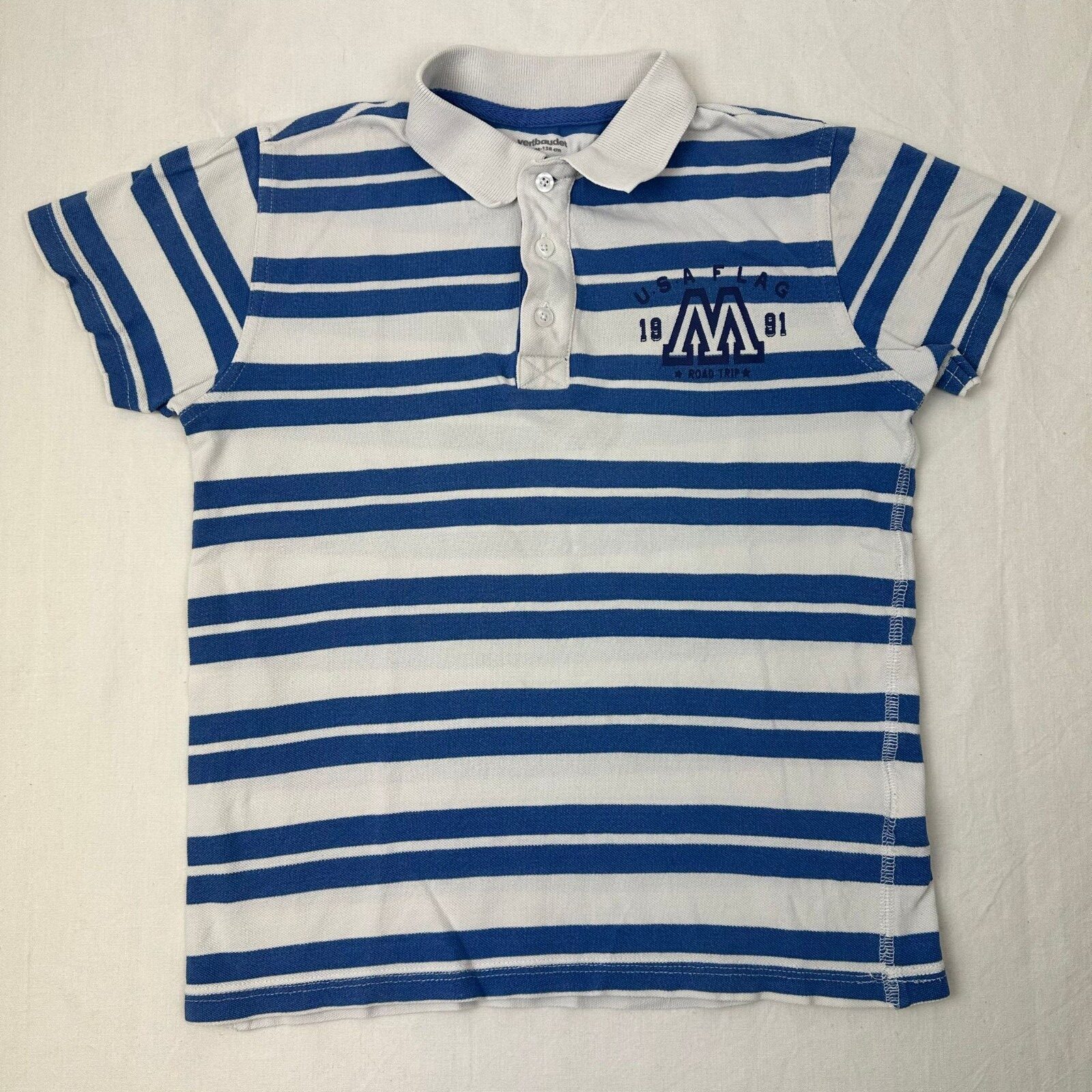 Autres commentaires : Polo manches courtes bleu et blanc à rayures avec une fermeture par boutons au col.