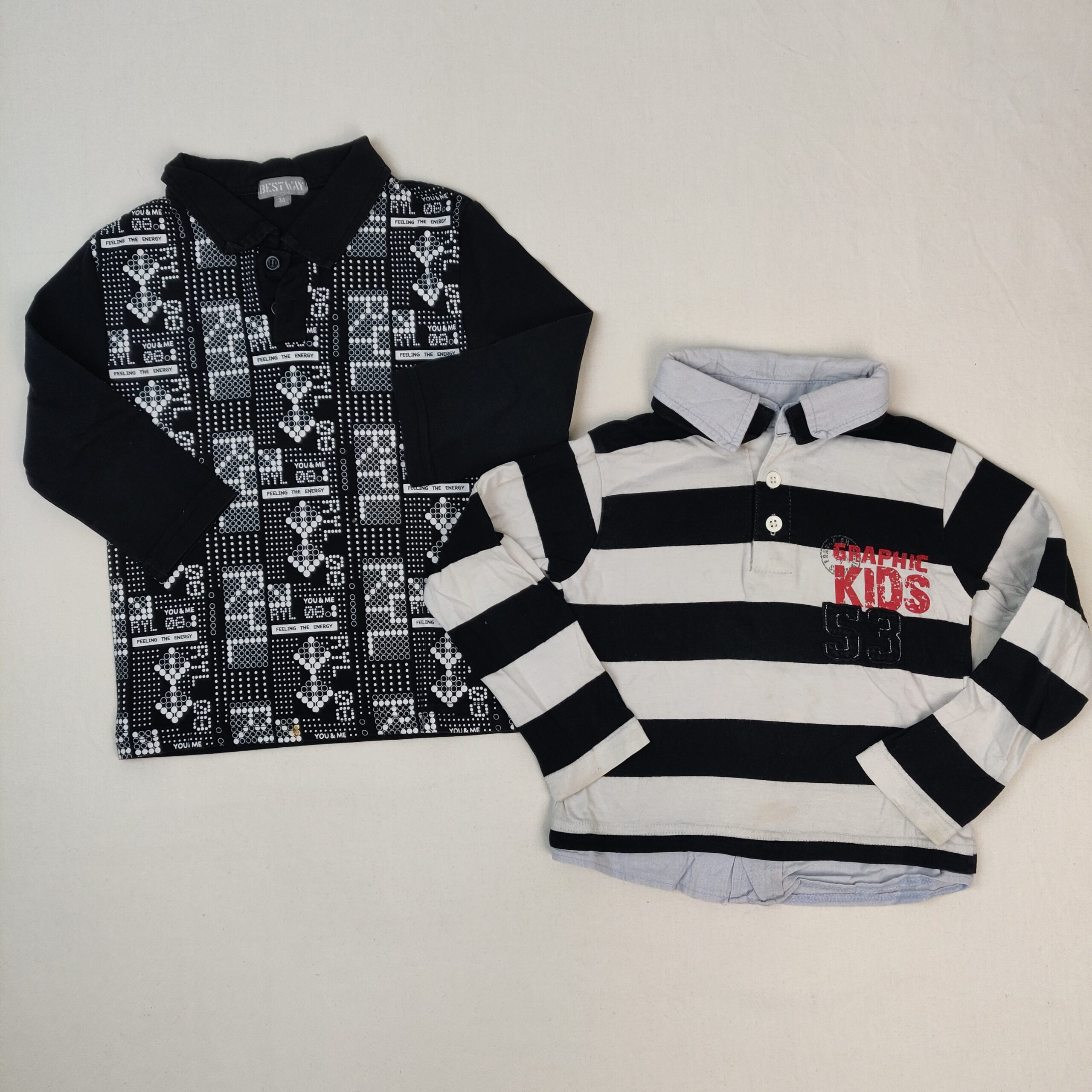 Autres commentaires : Polo noir manches longues BEST WAY, motifs pixels blancs avec inscriptions « Feeling the energy » et « YOU&ME » , fermeture par boutons devant. OFFERT : un 2ème polo manches longues Tissaïa, à rayures blanches et noires, effet sur-chemise bleu clair (dépasse en bas et double col), inscription « GRAPHIC KIDS 53 » devant – petites taches.