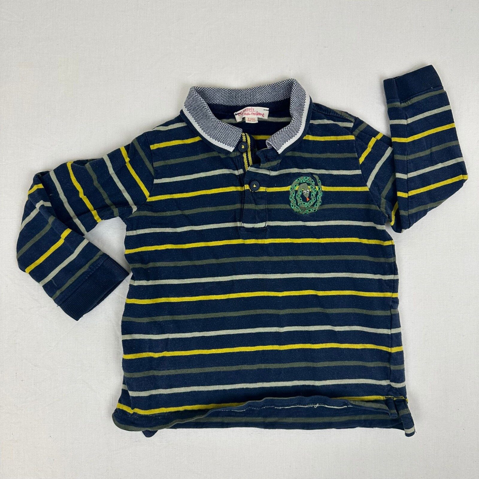Autres commentaires : Polo manches longues bleu avec rayures jaune,vert et beige. Contient quelques bouloches d’usages.