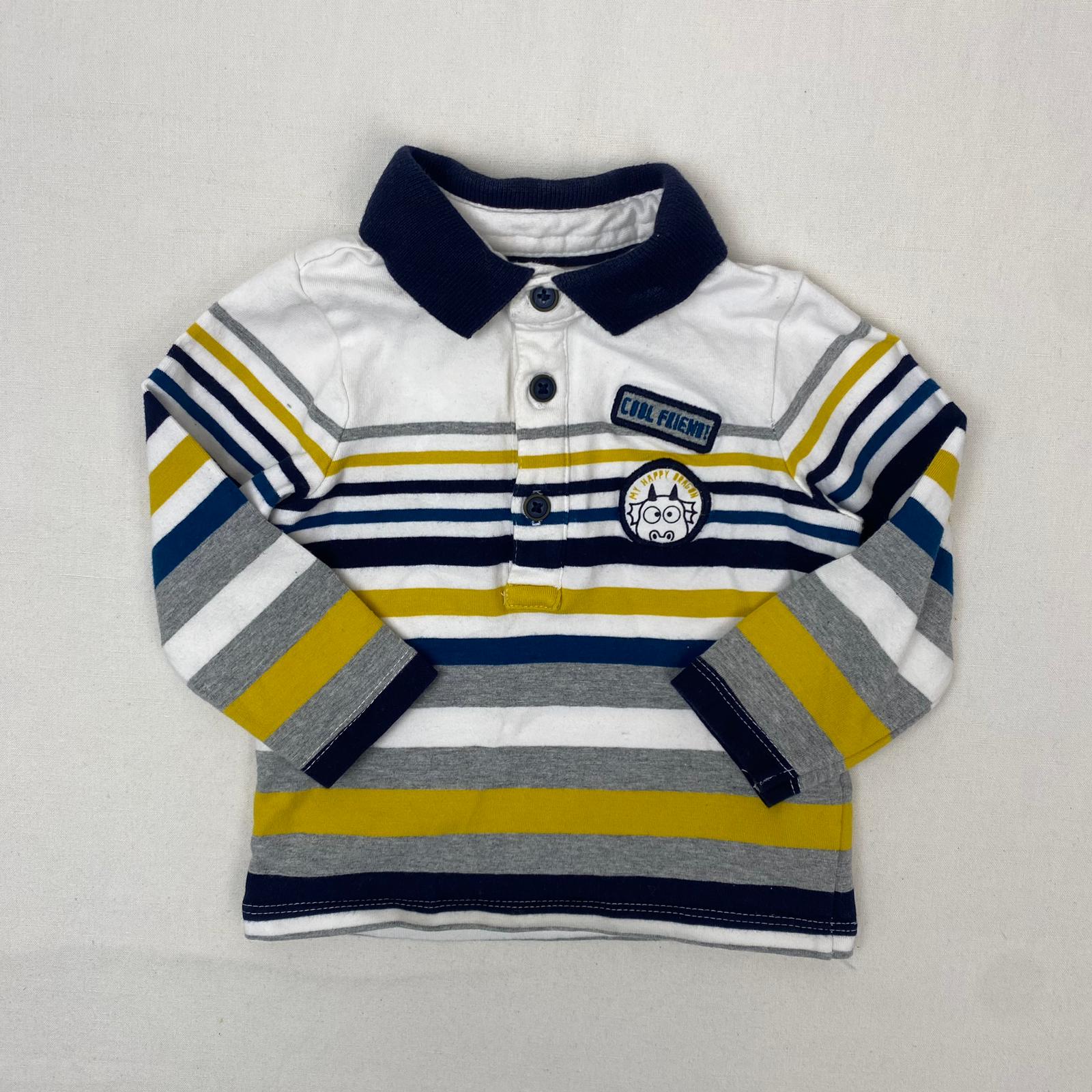 Autres commentaires : 5% élasthanne. Polo manches longues à rayures bleu, gris jaune et bleu foncé; fermeture par boutons devant, motif dragon, inscription « MY HAPPY DRAGON ».