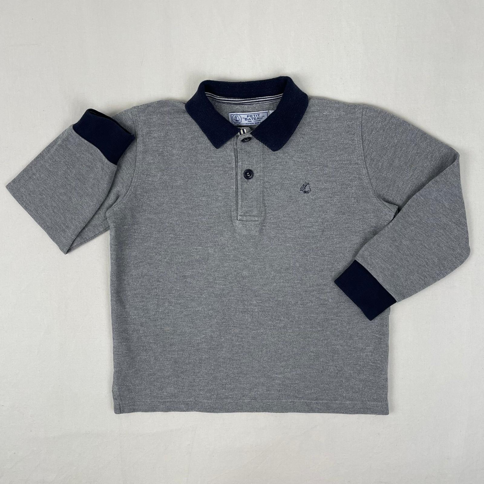 Polo manches longues gris, avec col et bout des manches bleu marine, et logo Petit Bateau côté coeur.