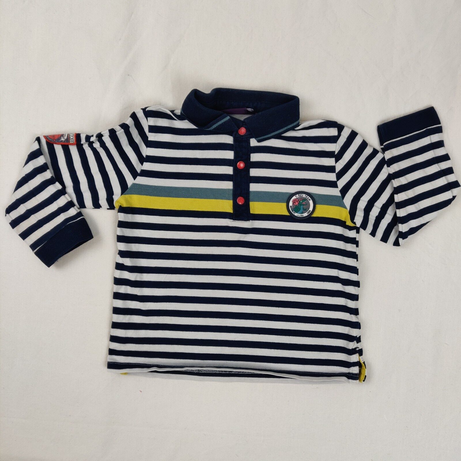 Autres commentaires : Polo manches longues blanc avec rayures bleu foncé et une fermeture au col par boutons.