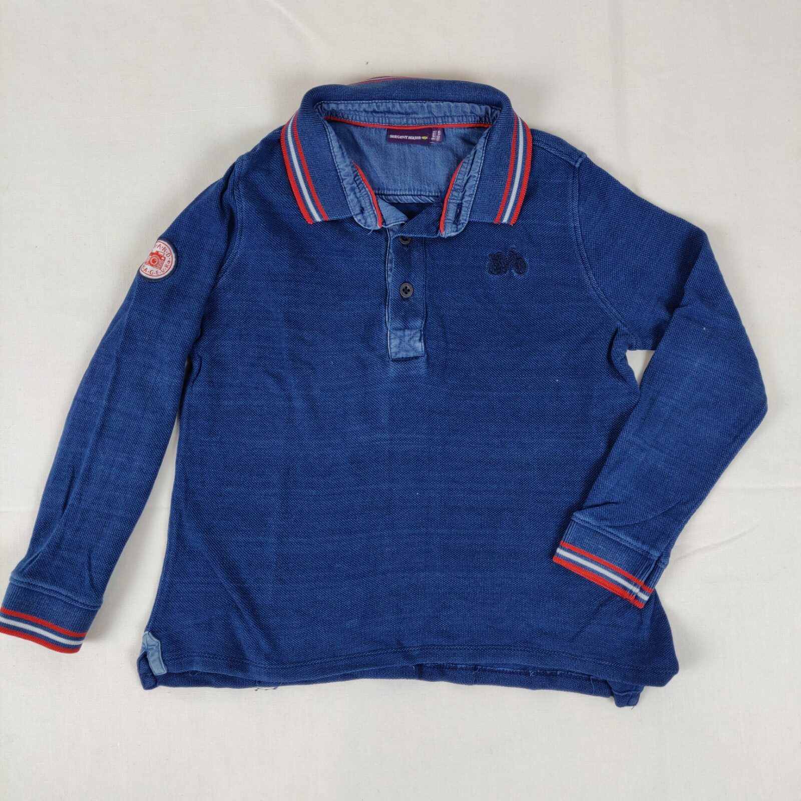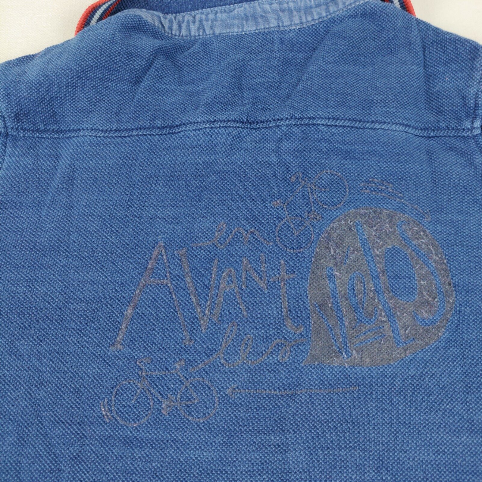 Autres commentaires : Polo manches longues – bleu marine avec motif vélo central bleu nuit. Ouverture centrale à 3 boutons classiques. Col et manches façon tricot élastique bleu, blanc et rouge. Motif central marron galçé au dos vélo avec inscription « En avant les vélos ». Ecusson brodé blanc et rouge appareil photo cousu à la manche droite. Usure normale du vêtement.