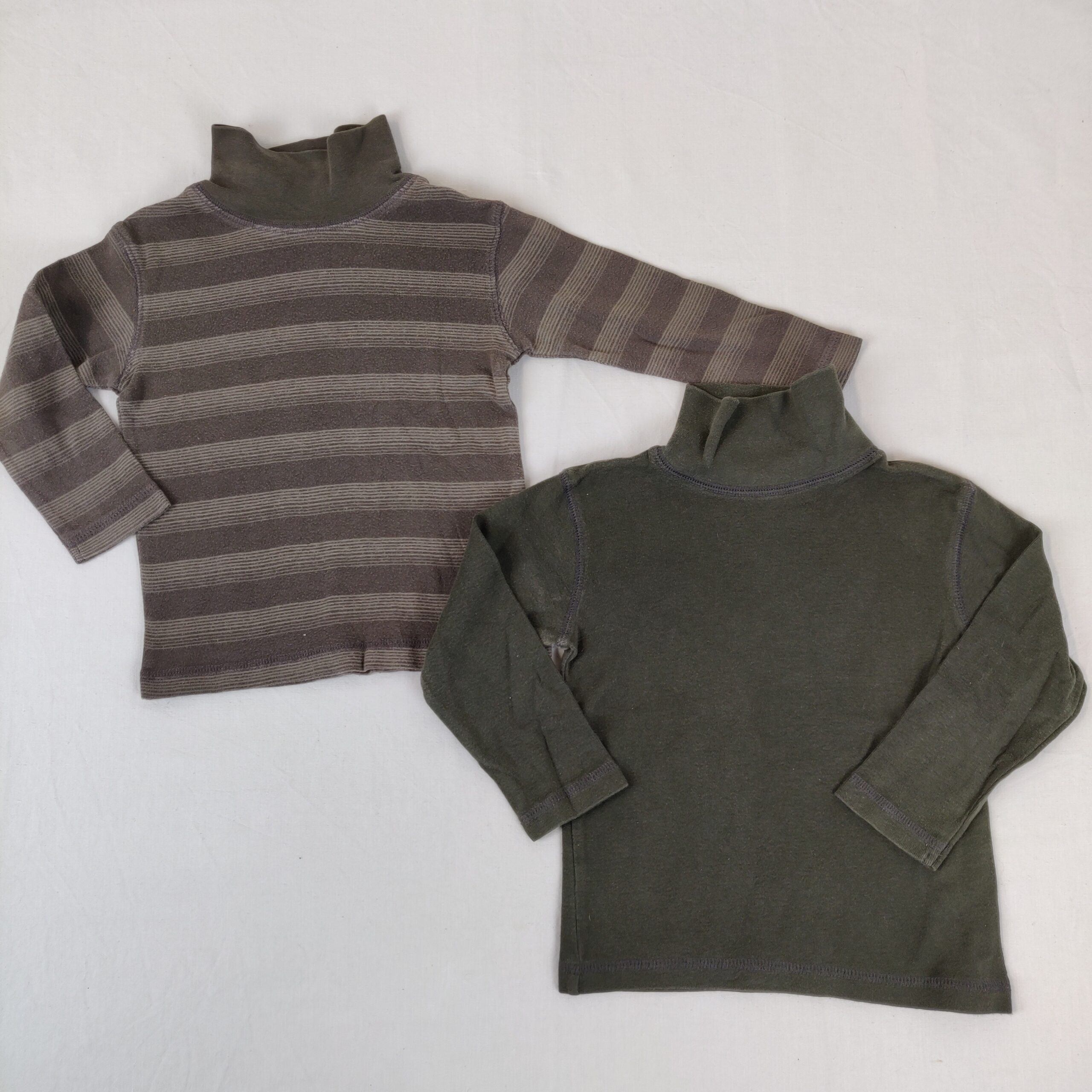Autres commentaires : Lot de 2 t-shirts à manches longues et à col roulé. Un t-shirt uni marron. Usure normale. Un t-shirt marron à fines rayures marron clair. Usure normale.
