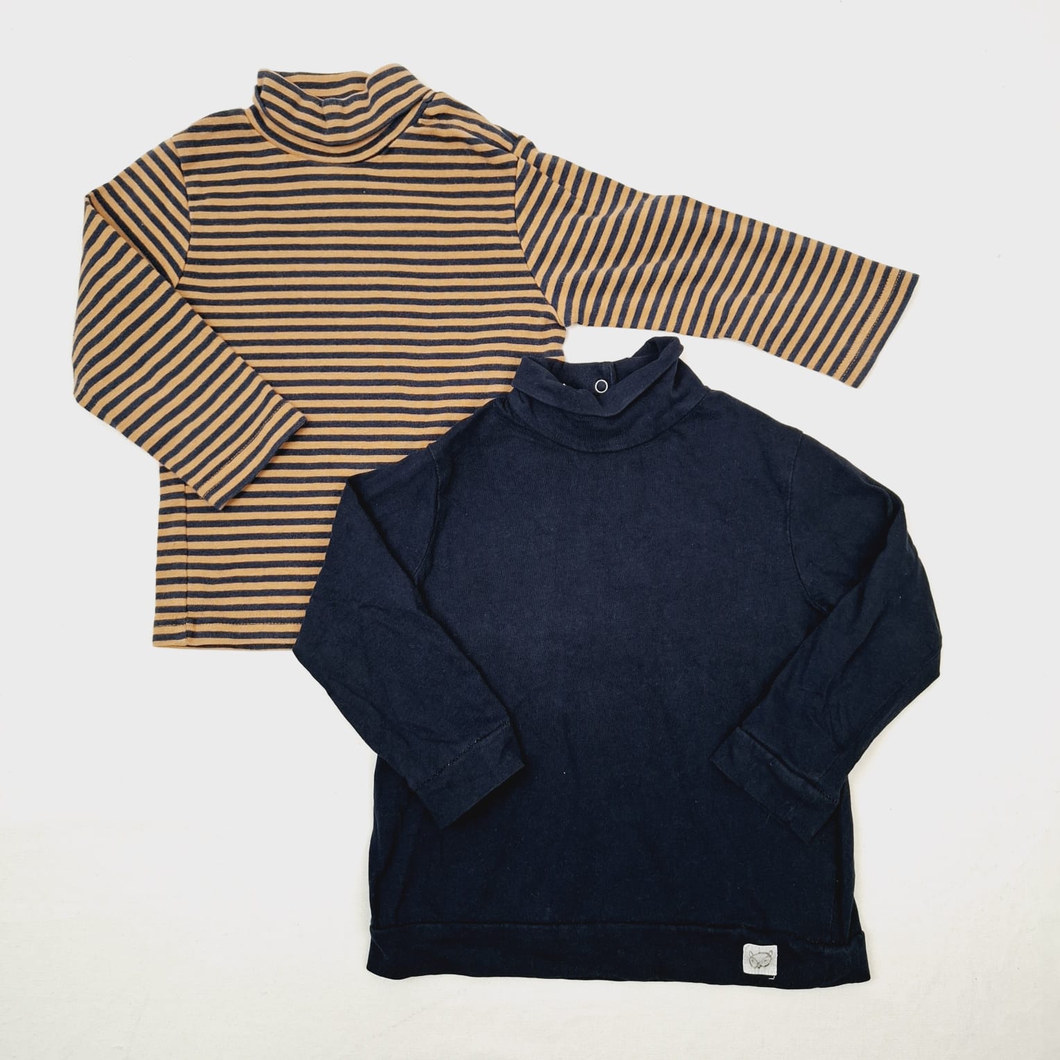 Autres commentaires : Ensemble t-shirt manches longues ZARA col rouler bleu foncé, t-shirt manches longues KIDKANAI col rouler a rayure beige et bleu foncé.