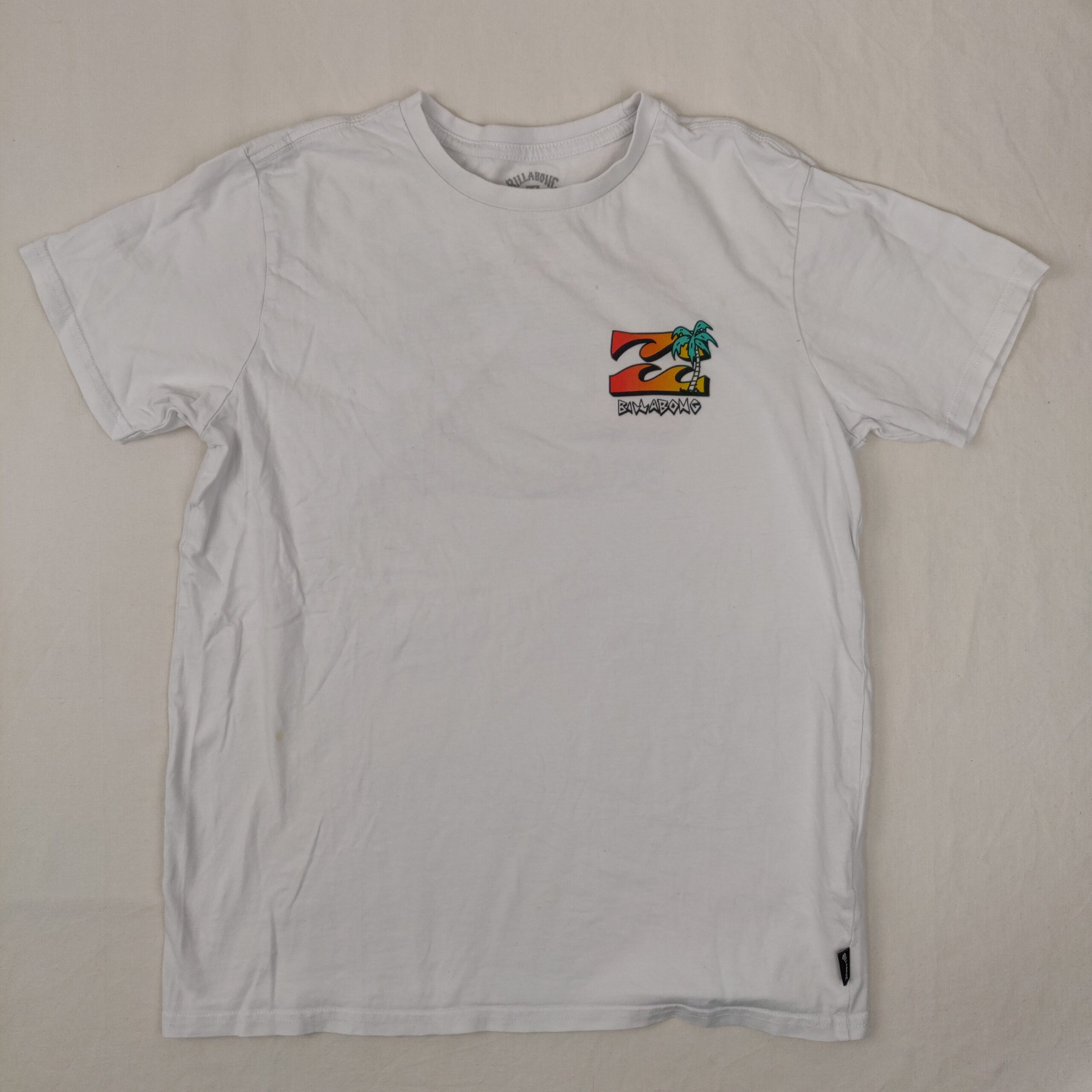 Autres commentaires : T-shirt manches courtes blanc Billabong avec le logo devant au niveau du coeur, et derrière en grand dans le dos. Petit défaut : tache jaune devant. Niveau baissé de fraise à myrtille.
