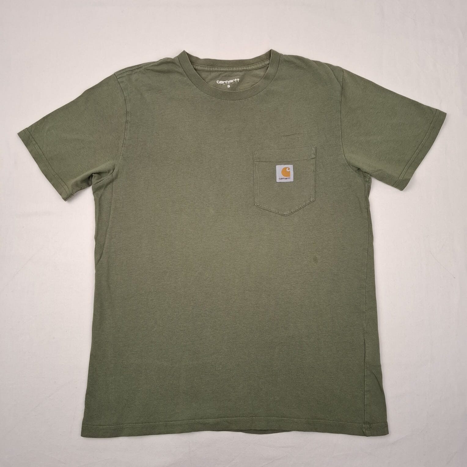 Autres commentaires : T-shirt vert kaki uni à manches courtes, col rond, poche plaqué devant, taille S..