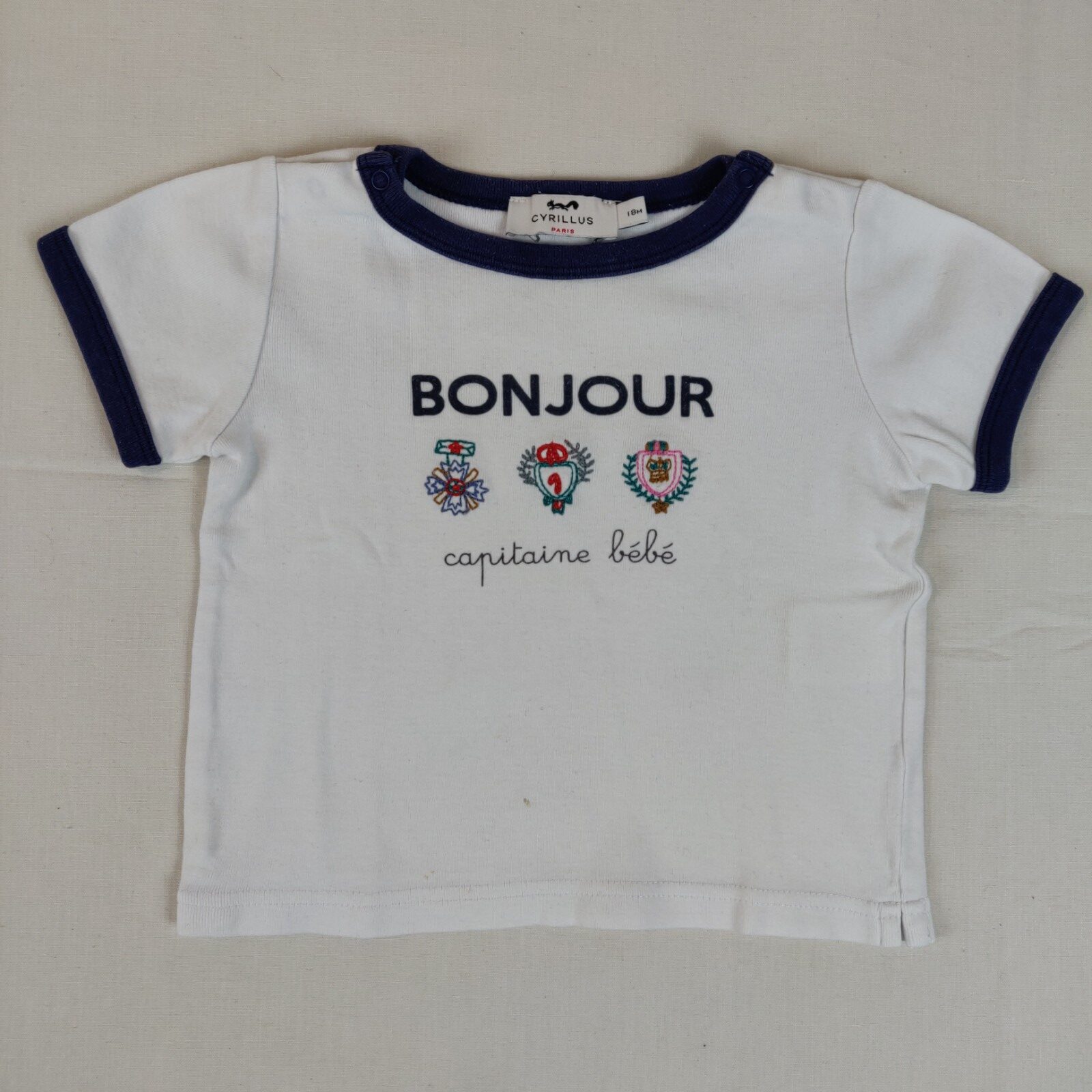 Autres commentaires : Tee-shirt manches courtes blanc avec bordures bleu marine, inscription Bonjour capitaine bébé et motif blason et médaille.