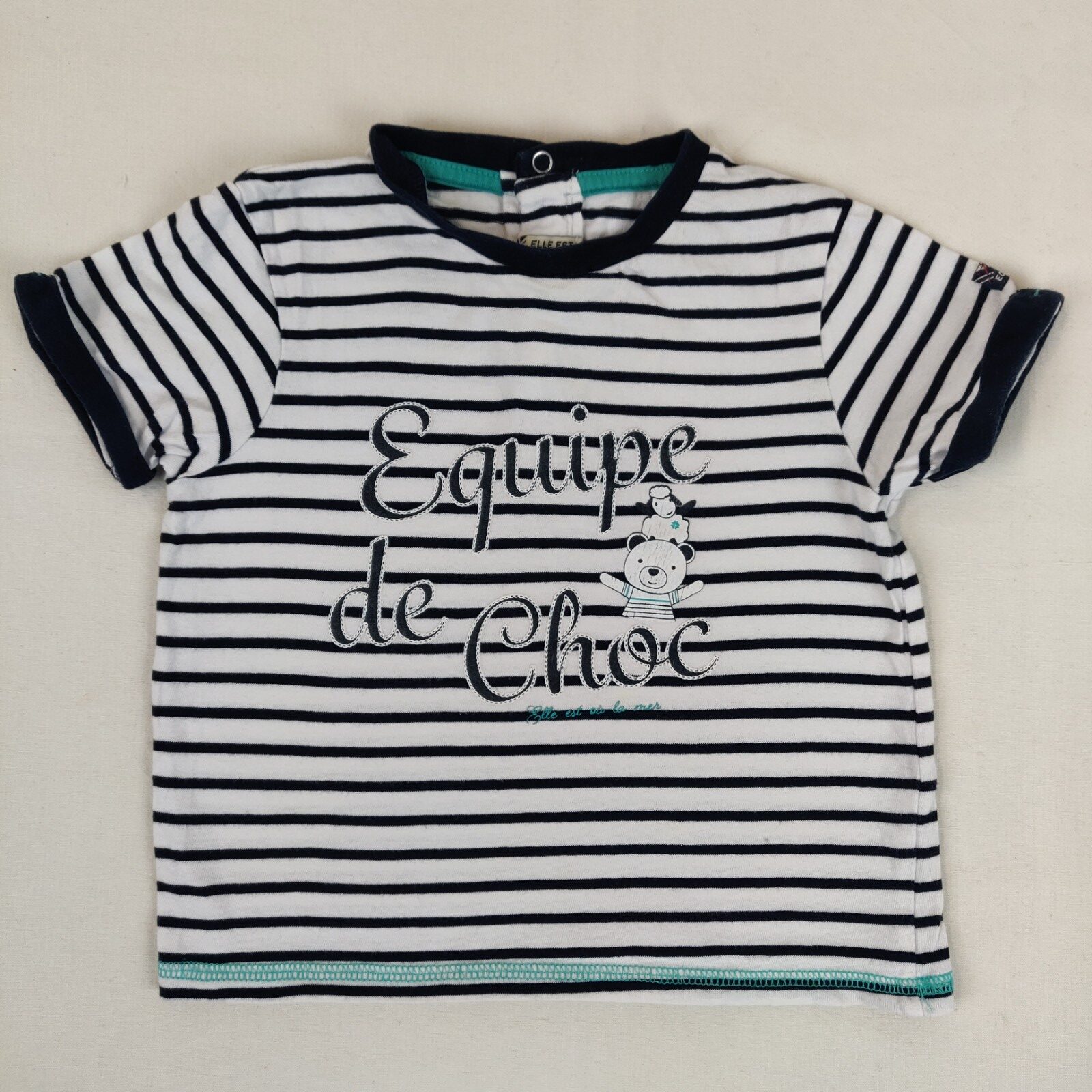 Autres commentaires : T-shirt blanc à manches courtes avec des rayures bleus horrizontales, soussigné au milieu « équipe de choc »avec une fermeture bouton de pression au dos.