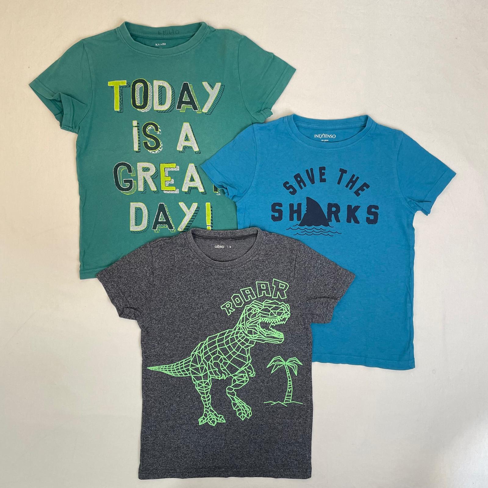 Lot de 3 T-shirts manches courtes: 1.T-shirt Gemo gris, col rond, devant motif dinosaure vert et inscription « Roaar »; 2. T-shirt Inextenso turquoise, col rond, devant motif aileron de requin et inscription « Save the sharks »; 3. T-shirt Kiabi vert, col rond, devant inscription « Today is a great day! ».