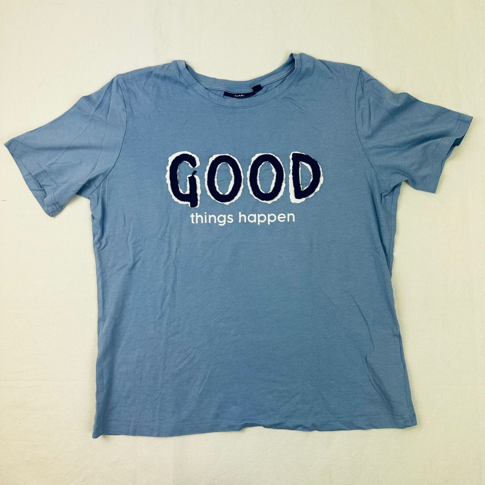 Autres commentaires : T-shirt manches courtes bleu avec motif centrale « MOOD things happen » bleu foncé.