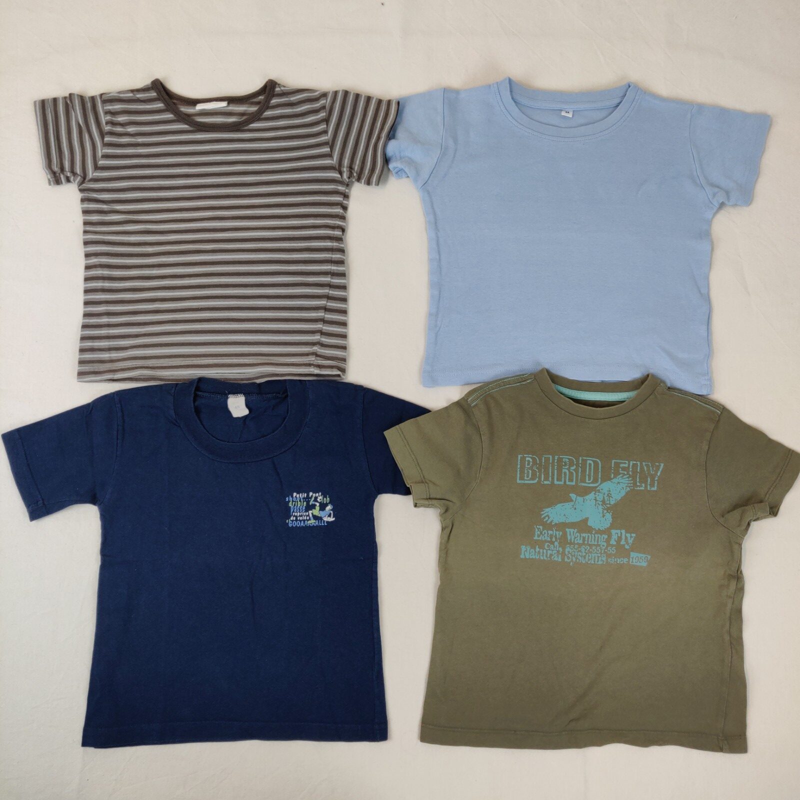 Autres commentaires : Lot de 4 t-shirts à manches courtes. Un t-shirt uni bleu. Un t-shirt Vertbaudet uni vert kaki. Coutures apparentes bleues. Motif central aigle accompagné de l’inscription « Bird Fly ». Un t-shirt rayé marron, marron clair et bleu. Un t-shirt sans marque – bleu marine. Motif central footballeur.