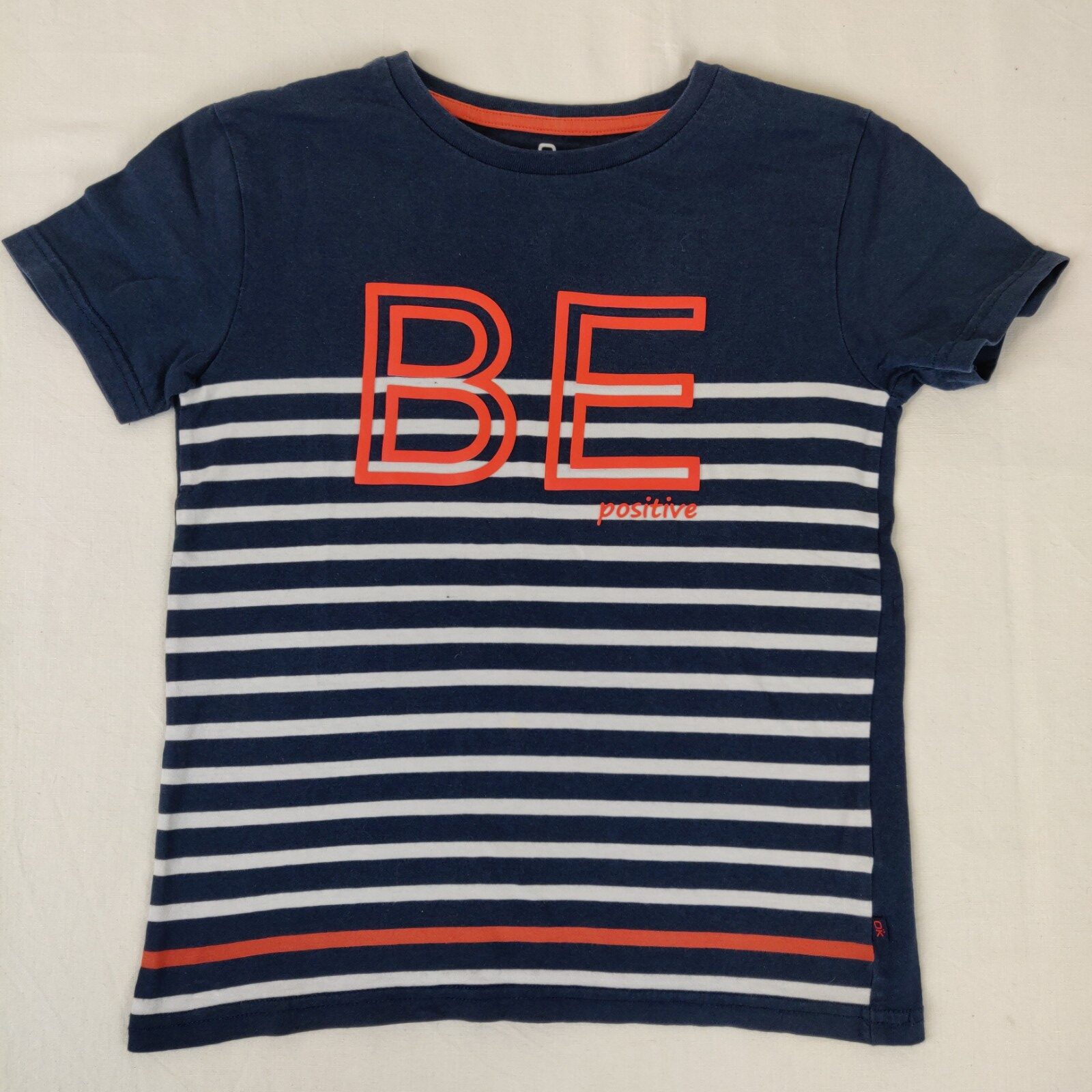Autres commentaires : T-shirt à manches courtes bleu. Rayures blanches horizontale et inscription « Be positive ».