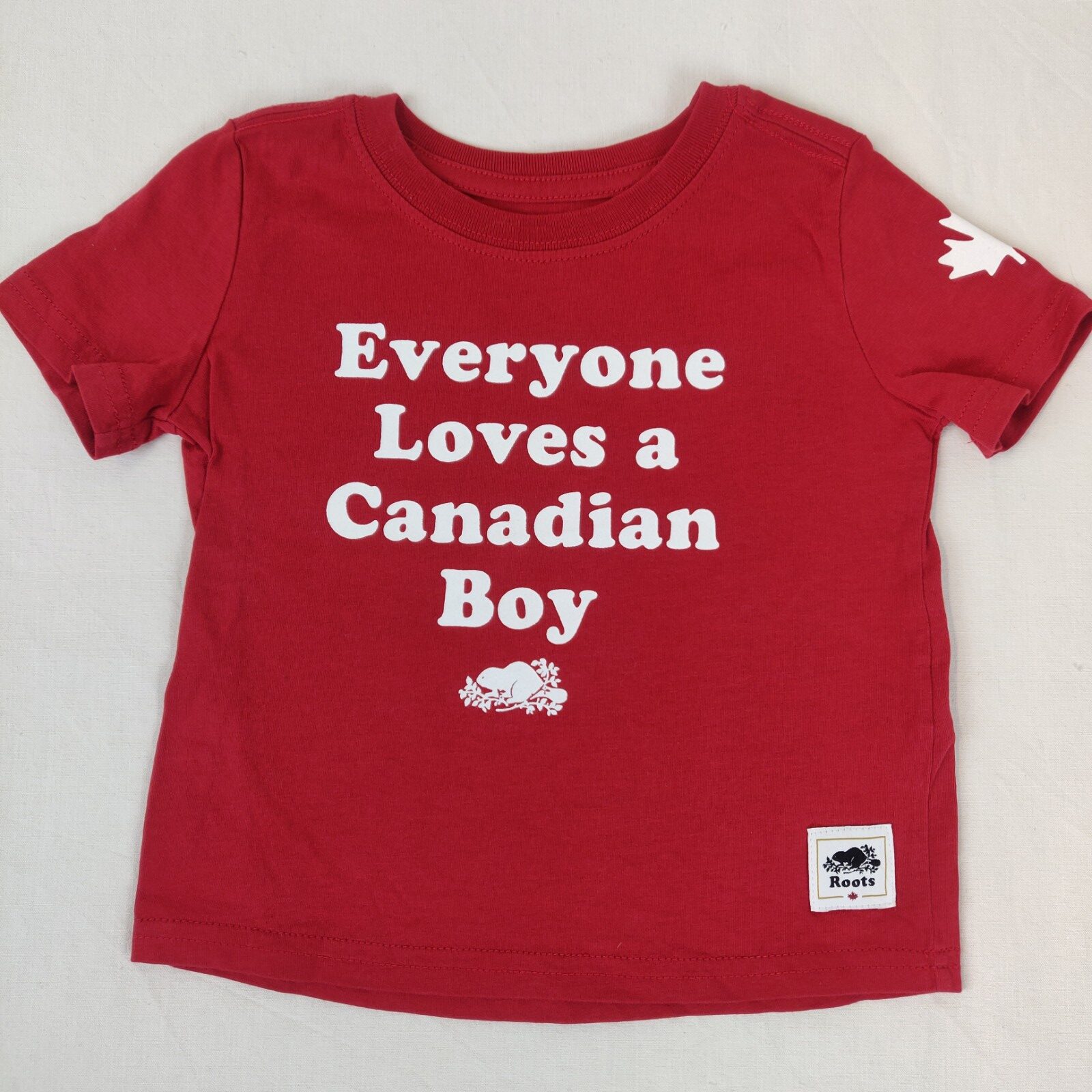 Autres commentaires : T-shirt à manches courtes – rouge. Inscription centrale blanche « Everyone loves a canadian boy ». Feuille d’érable blanche sur la manche gauche.