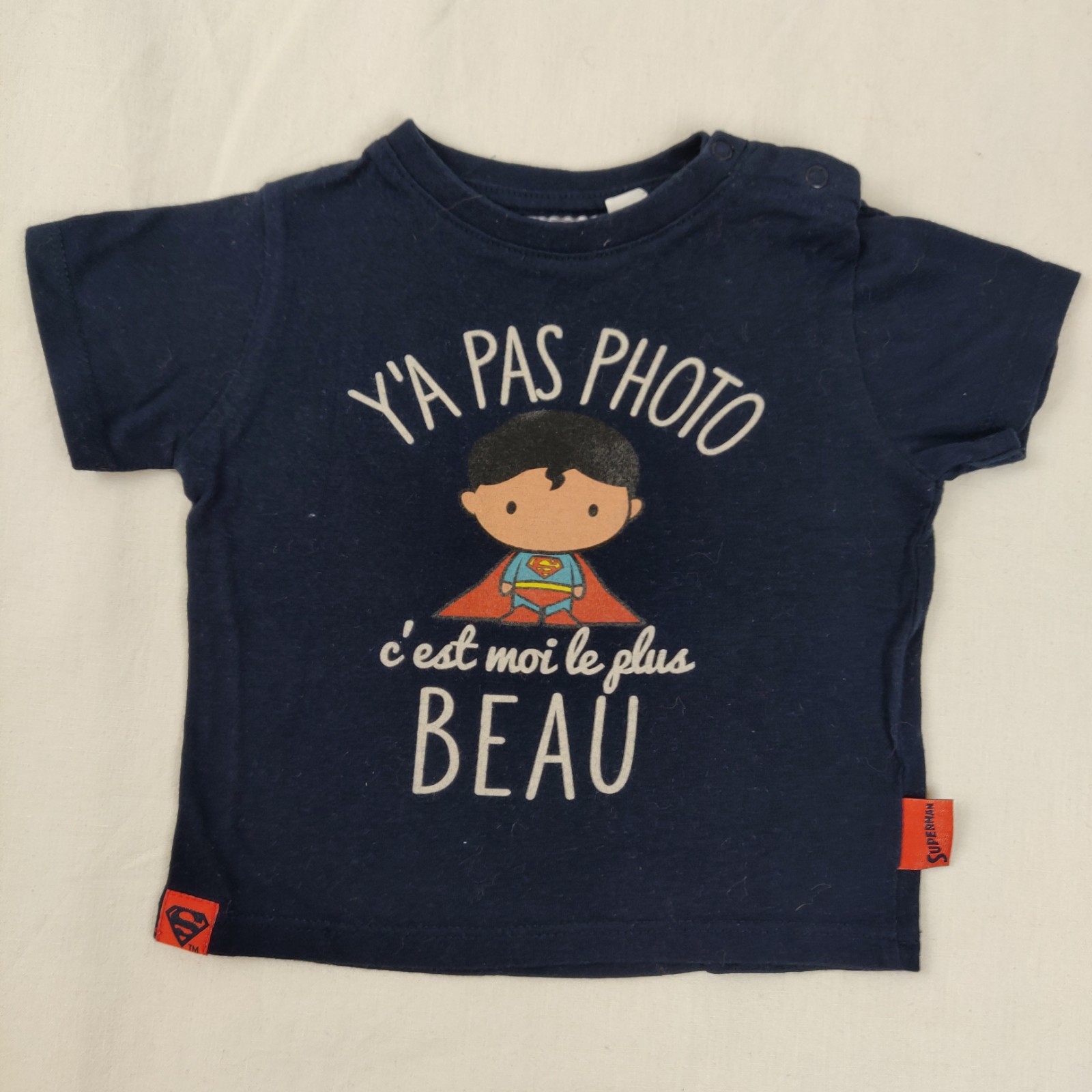 Autres commentaires : T-shirt manches courtes bleu foncé avec motif centrale « c’est moi le plus beau » et une fermeture à l’épaule par boutons pressions.